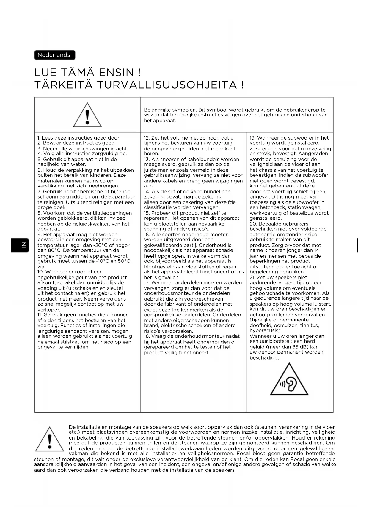 K2 POWER Handleiding Aanpassingsperiode De speakers bestaan uit complexe mechanische onderdelen die een aanpassingsperiode vereisen om optimaal te werken. Deze aanpassingsperiode verschilt naargelang de omstandigheden en kan verschillende weken duren. We raden u aan om de speakers minstens twintig opeenvolgende uren te laten werken op een gemiddeld geluidsniveau om deze periode te versnellen. Zodra de eigenschappen van uw speakers volledig stabiel zijn, kunt u volledig gebruik maken van het vermogen van uw producten uit het K2 Power-assortiment. Garantievoorwaarden Neem contact op met uw verkoper als er zich problemen voordoen. De Franse garantietermijn voor alle producten van Focal is 2 jaar vanaf de aankoopdatum. In geval van gebreken moet u deze op eigen kosten en in de originele verpakking, of in een verpakking die ook een optimale bescherming tijdens het verzendproces waarborgt, naar de verkoper retourneren. Uw leverancier zal het product analyseren en de aard van het defect bepalen. Indien het probleem onder de garantie valt en wordt voldaan aan de garantievoorwaarden, wordt het apparaat gerepareerd of vervangen overeenkomstig de toepasselijke voorwaarden. Indien de garantie verlopen is, zal u een offerte voor de reparatie ontvangen. De garantie geldt niet voor schade als gevolg van verkeerd gebruik of verkeerde aansluiting (bijvoorbeeld verbrande mobiele spoelen ...). Buiten Frankrijk valt het materiaal van Focal onder de lokaal toepasselijke garantievoorwaarden zoals bepaald door de officiële Focal-dealer van het respectievelijke land, die altijd in overeenstemming zijn met de geldende wetgeving van dat land.Metody instalacji i mocowania kolumn na dowolnych powierzchniach (wsporniki, mocowanie do podłogi itd.) powinny być zgodne z warunkami i normami dotyczącymi instalacji, rozmieszczenia, bezpieczeństwa i okablowania obowiązującymi dla danej powierzchni i podłoża. Ponadto produkty mogą wytwarzać drgania i uszkodzić podłoże, do którego są przymocowane. Z tego powodu operacja instalacji musi być wykonywana przez wykwalifikowanego specjalistę, zaznajomionego ze standardami instalacji i bezpieczeństwa. Firma Focal nie udziela żadnej gwarancji co do podłoża lub instalacji, a za realizację instalacji kolumn odpowiada wyłącznie klient. Dlatego firma Focal w żaden sposób nie ponosi odpowiedzialności za wszelkie incydenty, wypadki i/lub jakichkolwiek inne konsekwencje lub uszkodzenia związane z instalacją kolumn. Symbole ostrzeżeń. Ten symbol informuje użytkownika o obecności ważnych zaleceń, które dotyczą obsługi, użytkowania i konserwacji urządzenia.