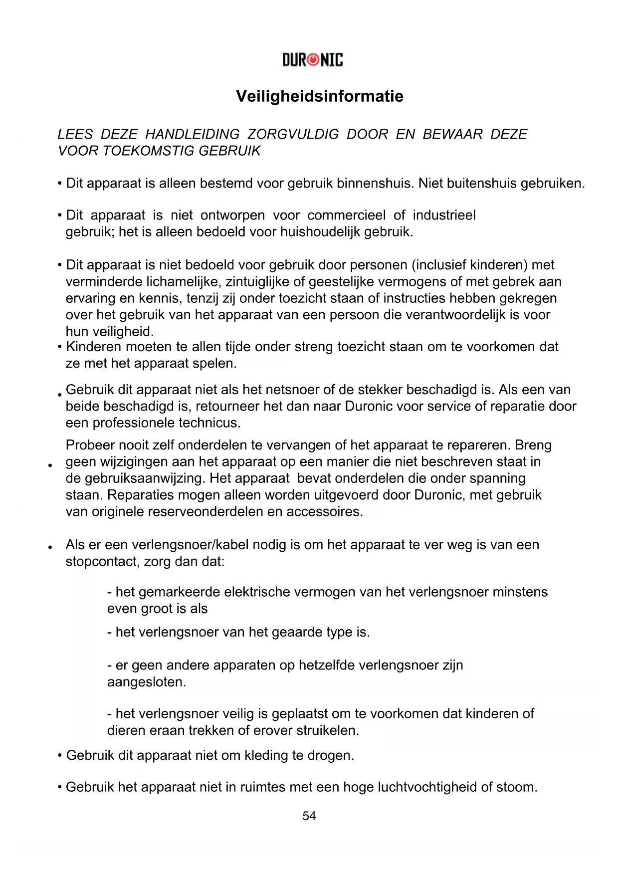 Probeer nooit zelf onderdelen te vervangen of het apparaat te repareren. Breng geen wijzigingen aan het apparaat op een manier die niet beschreven staat in de gebruiksaanwijzing. Het apparaat bevat onderdelen die onder spanning staan. Reparaties mogen alleen worden uitgevoerd door Duronic, met gebruik van originele reserveonderdelen en accessoires. Als er een verlengsnoer/kabel nodig is om het apparaat te ver weg is van een stopcontact, zorg dan dat: - het gemarkeerde elektrische vermogen van het verlengsnoer minstens even groot is als - het verlengsnoer van het geaarde type is. - er geen andere apparaten op hetzelfde verlengsnoer zijn aangesloten. - het verlengsnoer veilig is geplaatst om te voorkomen dat kinderen of dieren eraan trekken of erover struikelen.