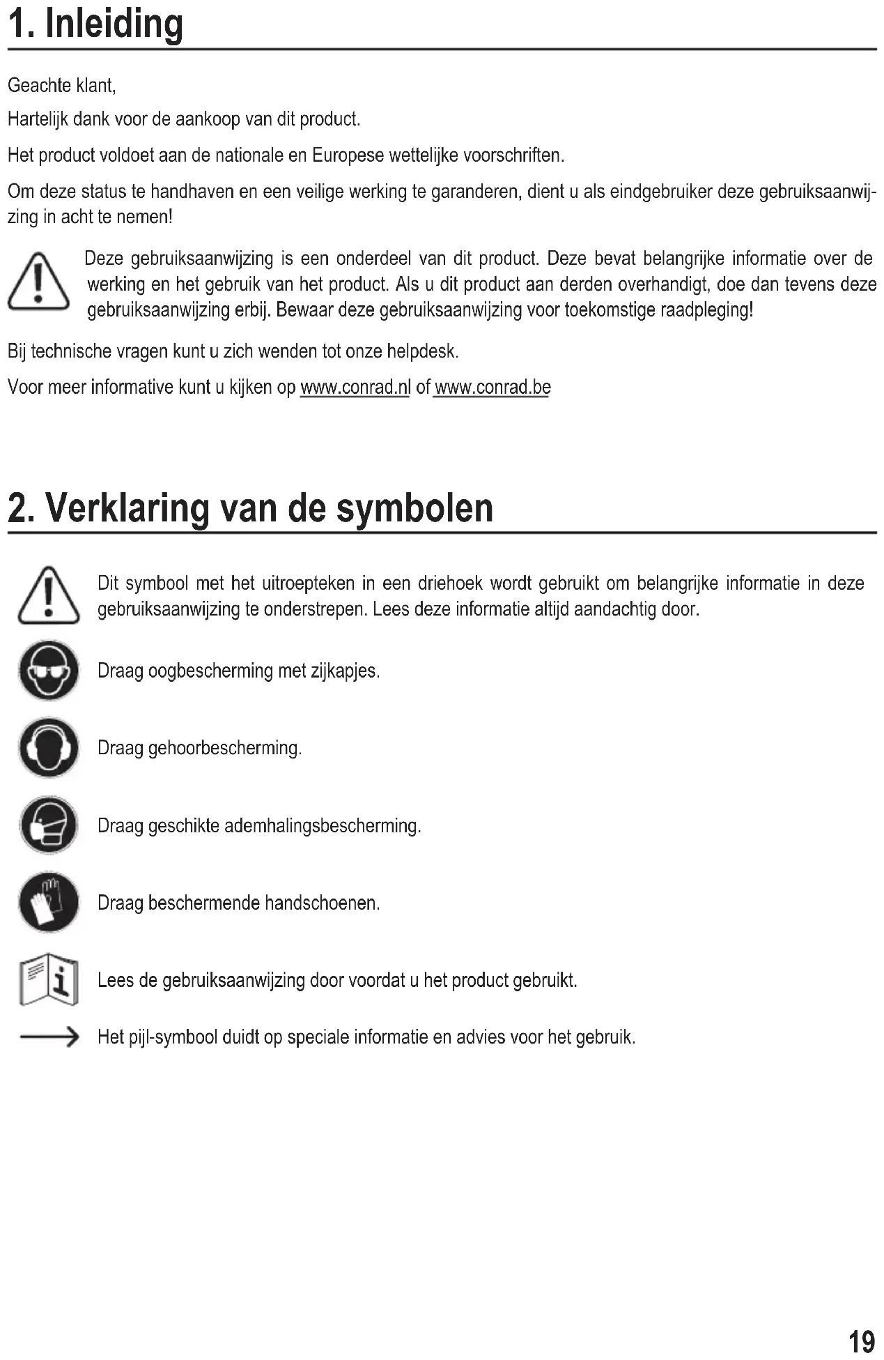 Geachte klant, Hartelijk dank voor de aankoop van dit product. Het product voldoet aan de nationale en Europese wettelijke voorschriften. Om deze status te handhaven en een veilige werking te garanderen, dient u als eindgebruiker deze gebruiksaanwij- zing in acht te nemen! Deze gebruiksaanwijzing is een onderdeel van dit product. Deze bevat belangrijke informatie over de werking en het gebruik van het product. Als u dit product aan derden overhandigt, doe dan tevens deze gebruiksaanwijzing erbij. Bewaar deze gebruiksaanwijzing voor toekomstige raadpleging! Bij technische vragen kunt u zich wenden tot onze helpdesk. Voor meer informative kunt u kijken op www.conrad.nl of www.conrad.be