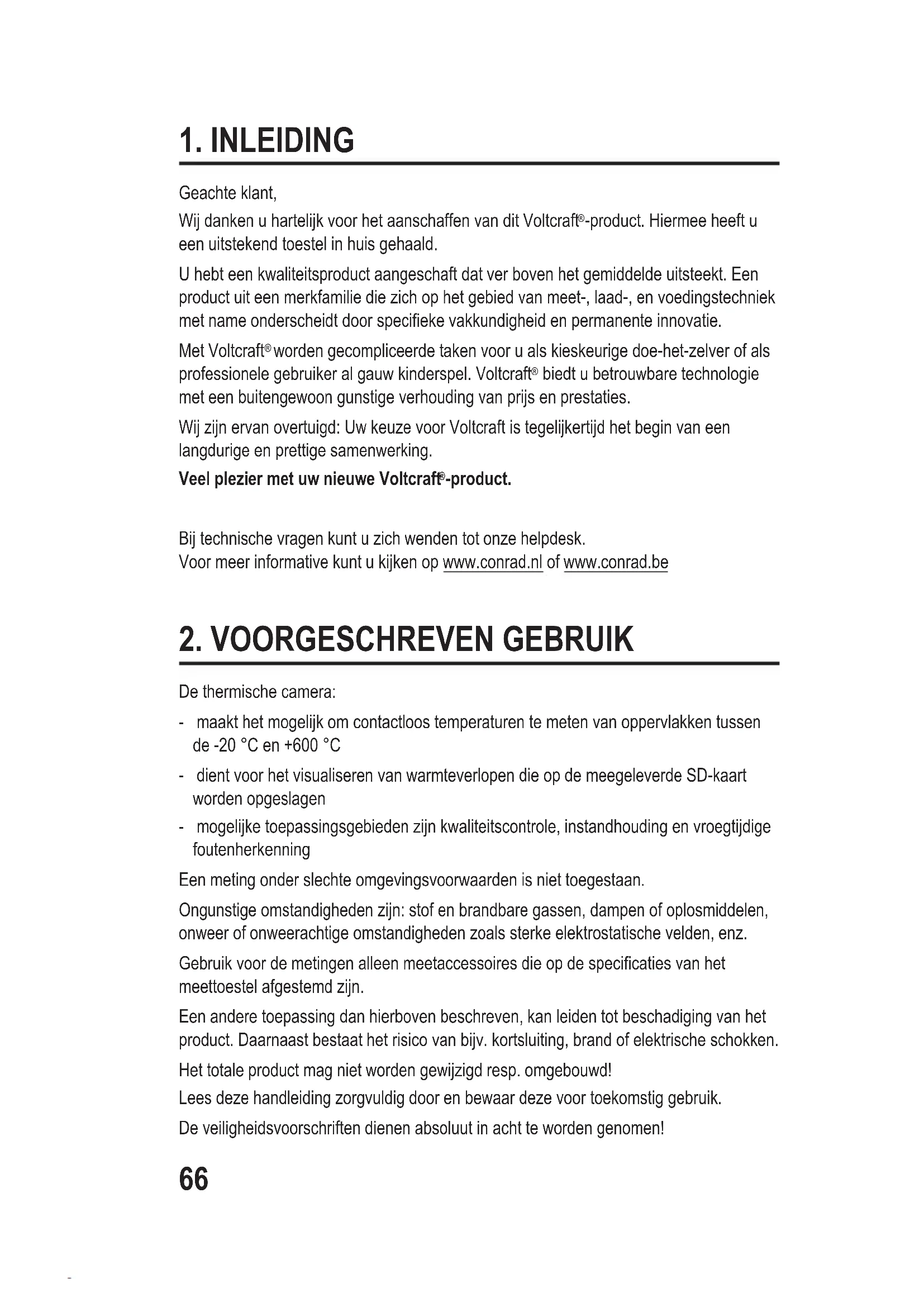 De thermische camera: - maakt het mogelijk om contactloos temperaturen te meten van oppervlakken tussen de -20 °C en +600 °C - dient voor het visualiseren van warmteverlopen die op de meegeleverde SD-kaart worden opgeslagen - mogelijke toepassingsgebieden zijn kwaliteitscontrole, instandhouding en vroegtijdige foutenherkenning Een meting onder slechte omgevingsvoorwaarden is niet toegestaan. Ongunstige omstandigheden zijn: stof en brandbare gassen, dampen of oplosmiddelen, onweer of onweerachtige omstandigheden zoals sterke elektrostatische velden, enz. Gebruik voor de metingen alleen meetaccessoires die op de specicaties van het meettoestel afgestemd zijn. Een andere toepassing dan hierboven beschreven, kan leiden tot beschadiging van het product. Daarnaast bestaat het risico van bijv. kortsluiting, brand of elektrische schokken. Het totale product mag niet worden gewijzigd resp. omgebouwd! Lees deze handleiding zorgvuldig door en bewaar deze voor toekomstig gebruik. De veiligheidsvoorschriften dienen absoluut in acht te worden genomen!67