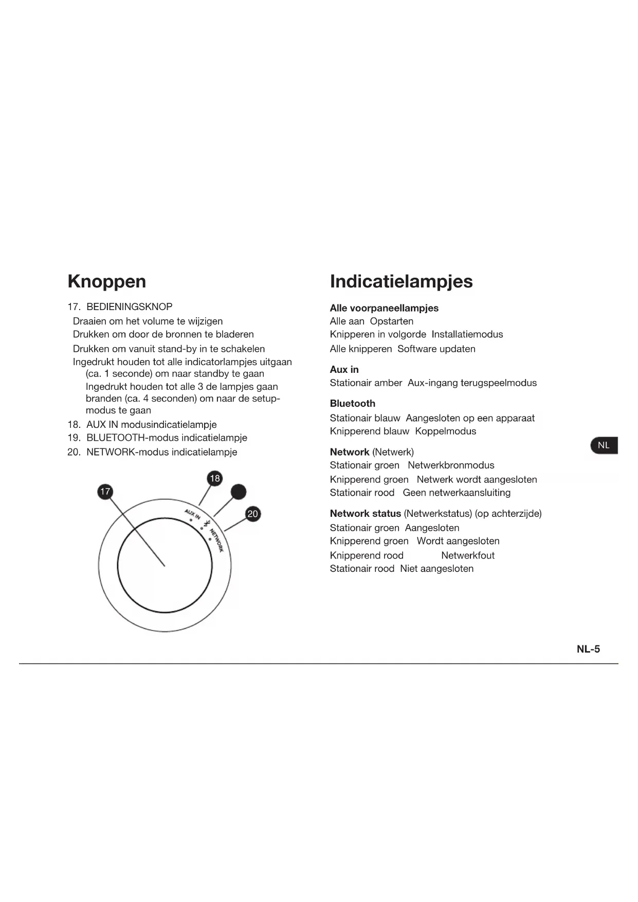Indicatielampjes Alle voorpaneellampjes Alle aan Opstarten Knipperen in volgorde Installatiemodus Alle knipperen Software updaten Aux in Stationair amber Aux-ingang terugspeelmodus Bluetooth Stationair blauw Aangesloten op een apparaat Knipperend blauw Koppelmodus Network (Netwerk) Stationair groen Netwerkbronmodus Knipperend groen Netwerk wordt aangesloten Stationair rood Geen netwerkaansluiting Network status (Netwerkstatus) (op achterzijde) Stationair groen Aangesloten Knipperend groen Wordt aangesloten Knipperend rood Netwerkfout Stationair rood Niet aangeslotenNL-6 Installatie