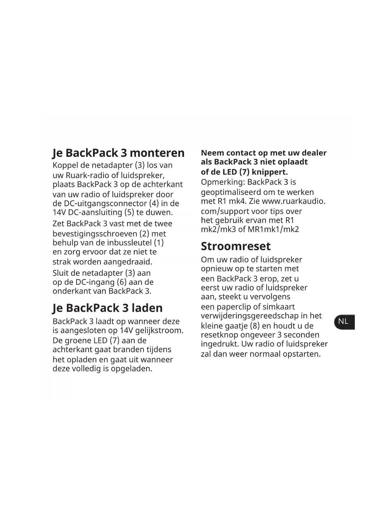 Je BackPack 3 monteren Koppel de netadapter (3) los van uw Ruark-radio of luidspreker, plaats BackPack 3 op de achterkant van uw radio of luidspreker door de DC-uitgangsconnector (4) in de 14V DC-aansluiting (5) te duwen. Zet BackPack 3 vast met de twee bevestigingsschroeven (2) met behulp van de inbussleutel (1) en zorg ervoor dat ze niet te strak worden aangedraaid. Sluit de netadapter (3) aan op de DC-ingang (6) aan de onderkant van BackPack 3. Je BackPack 3 laden BackPack 3 laadt op wanneer deze is aangesloten op 14V gelijkstroom. De groene LED (7) aan de achterkant gaat branden tijdens het opladen en gaat uit wanneer deze volledig is opgeladen. Neem contact op met uw dealer als BackPack 3 niet oplaadt of de LED (7) knippert. Opmerking: BackPack 3 is geoptimaliseerd om te werken met R1 mk4. Zie www.ruarkaudio. com/support voor tips over het gebruik ervan met R1 mk2/mk3 of MR1mk1/mk2 Stroomreset Om uw radio of luidspreker opnieuw op te starten met een BackPack 3 erop, zet u eerst uw radio of luidspreker aan, steekt u vervolgens een paperclip of simkaart verwijderingsgereedschap in het kleine gaatje (8) en houdt u de resetknop ongeveer 3 seconden ingedrukt. Uw radio of luidspreker zal dan weer normaal opstarten.Veiligheidsinformatie BEVAT LITHIUMIONENCELLEN ● Probeer nooit om ongeacht welke reden het batterijpakket te openen. Wanneer de mantel van het batterijpakket gebarsten of beschadigd is, niet aansluiten op een radio of speaker. Het batterijpakket niet pletten, laten vallen of beschadigen. Een batterijpakket dat gevallen of op enige manier beschadigd is niet gebruiken. Beschadigde batterijpakketten dienen naar het servicecentrum teruggestuurd of gerecycled te worden. ● Het batterijpakket niet verbranden, ook niet als het ernstig beschadigd of volledig versleten is. ● Wanneer de inhoud van de batterij in contact met de huid komt, de plek onmiddellijk wassen met milde zeep en water. ● Lees deze gebruikershandleiding en volg alle instructies, het zal je helpen bij het correct opstellen en bedienen van je product. ● Let op alle waarschuwingen en bewaar deze gebruikershandleiding voor toekomstig gebruik. ● Laat al het onderhoud over aan gekwaliceerd servicepersoneel. ● Dit apparaat is ALLEEN bedoeld voor bediening vanaf de AC-spanningen die op het het apparaat worden vermeld of bijbehorende stroomvoorziening. Bediening vanuit andere spanningen dan de aangegeven kunnen onherstelbare schade aan het apparaat veroorzaken waardoor de productgarantie kan komen te vervallen. ● Gebruik alleen de met de originele Ruark-radio of speakers meegeleverde stroomvoorziening of een goedgekeurd alternatief. ● Controleer of de stroomadapter, netstroomstekker of netstroomaansluiting in de eenheid gemakkelijk toegankelijkEN