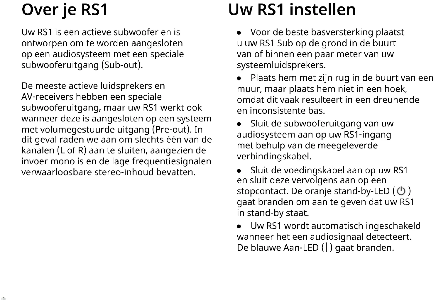 Over je RS1 Uw RS1 is een actieve subwoofer en is ontworpen om te worden aangesloten op een audiosysteem met een speciale subwooferuitgang (Sub-out). De meeste actieve luidsprekers en AV-receivers hebben een speciale subwooferuitgang, maar uw RS1 werkt ook wanneer deze is aangesloten op een systeem met volumegestuurde uitgang (Pre-out). In dit geval raden we aan om slechts één van de kanalen (L of R) aan te sluiten, aangezien de invoer mono is en de lage frequentiesignalen verwaarloosbare stereo-inhoud bevatten. Uw RS1 instellen ● Voor de beste basversterking plaatst u uw RS1 Sub op de grond in de buurt van of binnen een paar meter van uw systeemluidsprekers. ● Plaats hem met zijn rug in de buurt van een muur, maar plaats hem niet in een hoek, omdat dit vaak resulteert in een dreunende en inconsistente bas. ● Sluit de subwooferuitgang van uw audiosysteem aan op uw RS1-ingang met behulp van de meegeleverde verbindingskabel. ● Sluit de voedingskabel aan op uw RS1 en sluit deze vervolgens aan op een stopcontact. De oranje stand-by-LED (