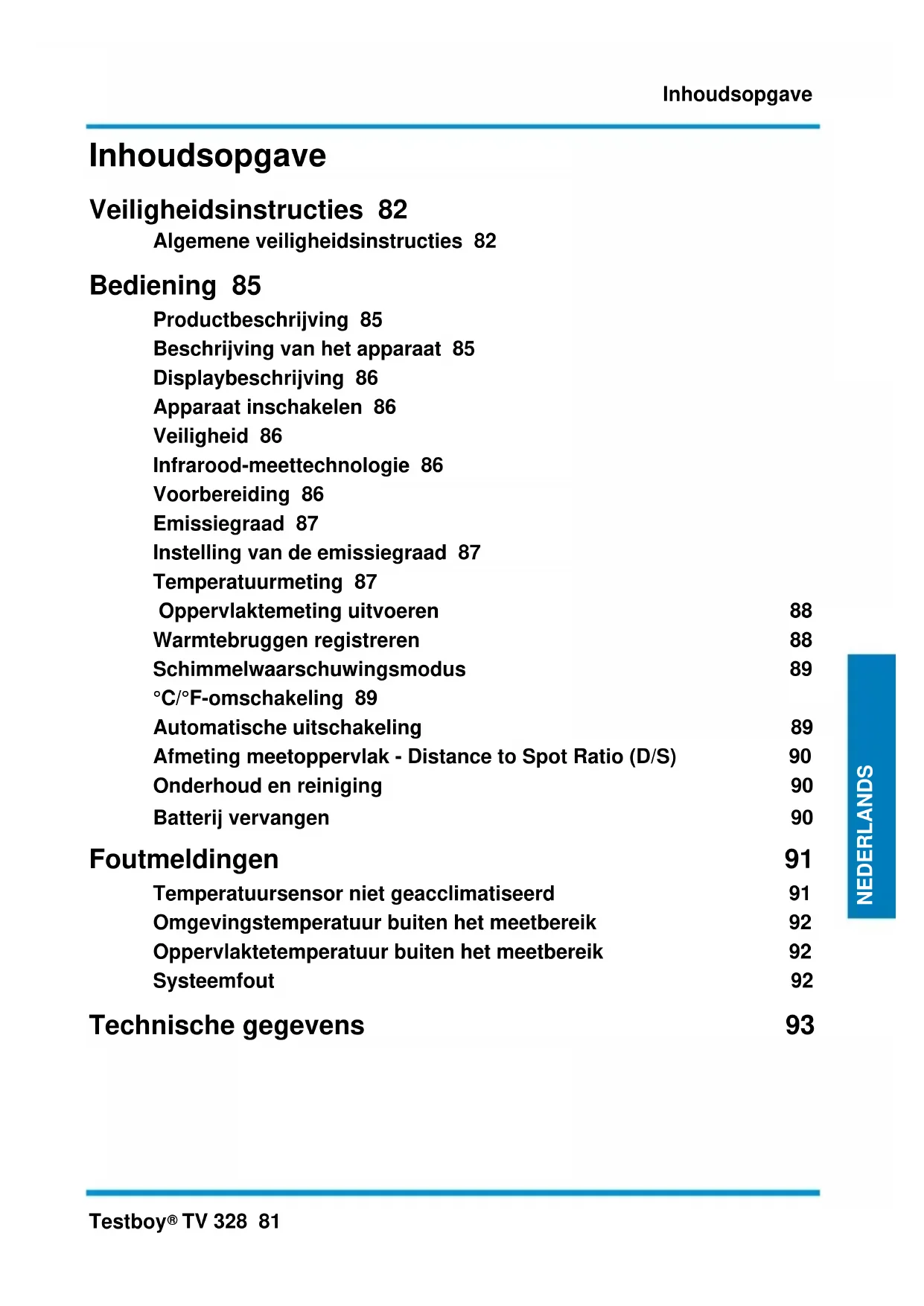 TV 328 81 NEDERLANDS Inhoudsopgave Veiligheidsinstructies 82 Algemene veiligheidsinstructies 82 Bediening 85 Productbeschrijving 85 Beschrijving van het apparaat 85 Displaybeschrijving 86 Apparaat inschakelen 86 Veiligheid 86 Infrarood-meettechnologie 86 Voorbereiding 86 Emissiegraad 87 Instelling van de emissiegraad 87 Temperatuurmeting 87 Oppervlaktemeting uitvoeren 88 Warmtebruggen registreren 88 Schimmelwaarschuwingsmodus 89 °C/°F-omschakeling 89 Automatische uitschakeling 89 Afmeting meetoppervlak - Distance to Spot Ratio (D/S) 90 Onderhoud en reiniging 90 Batterij vervangen 90 Foutmeldingen 91 Temperatuursensor niet geacclimatiseerd 91 Omgevingstemperatuur buiten het meetbereik 92 Oppervlaktetemperatuur buiten het meetbereik 92 Systeemfout 92 Technische gegevens 93Veiligheidsinstructies 82 Testboy