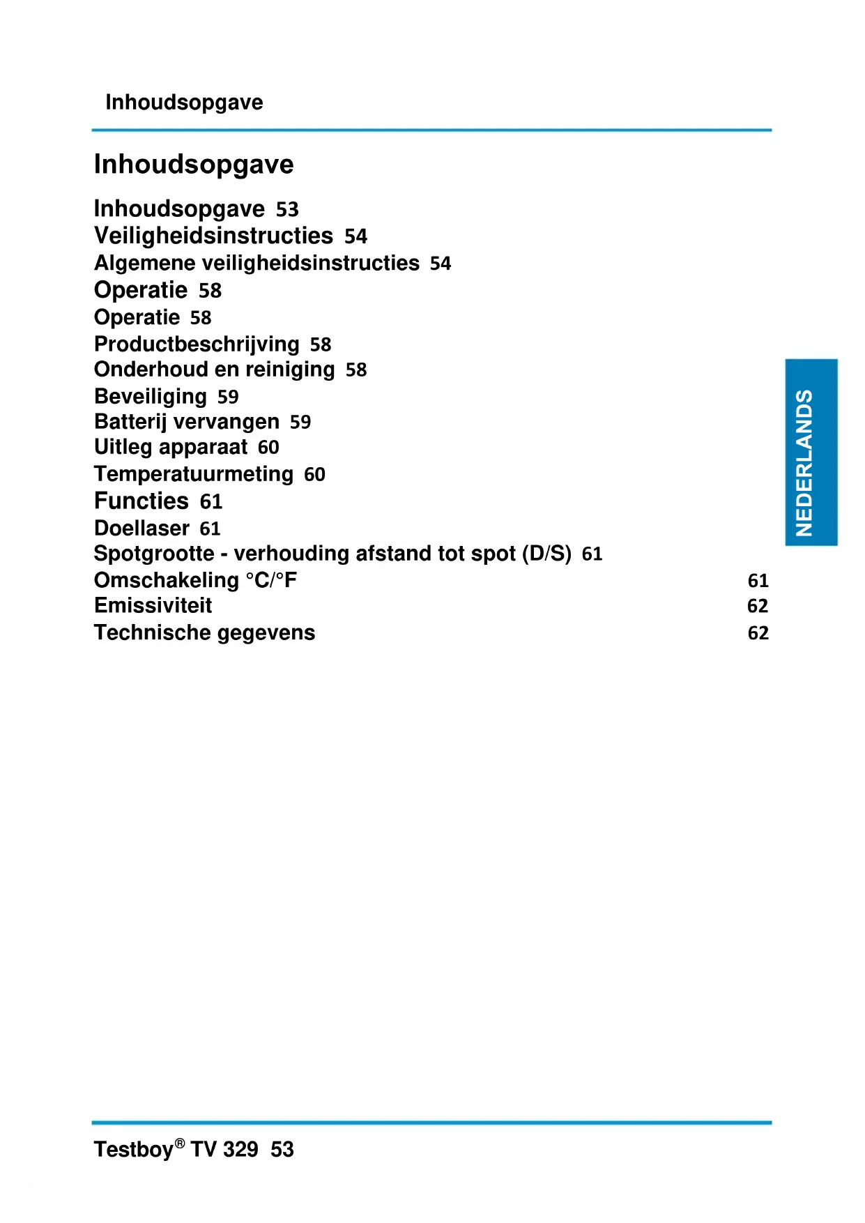 Inhoudsopgave Inhoudsopgave 53 Veiligheidsinstructies 54 Algemene veiligheidsinstructies 54 Operatie 58 Operatie 58 Productbeschrijving 58 Onderhoud en reiniging 58 Beveiliging 59 Batterij vervangen 59 Uitleg apparaat 60 Temperatuurmeting 60 Functies 61 Doellaser 61 Spotgrootte - verhouding afstand tot spot (D/S) 61 Omschakeling °C/°F 61 Emissiviteit 62 Technische gegevens 62Veiligheidsinstructies 54 Testboy