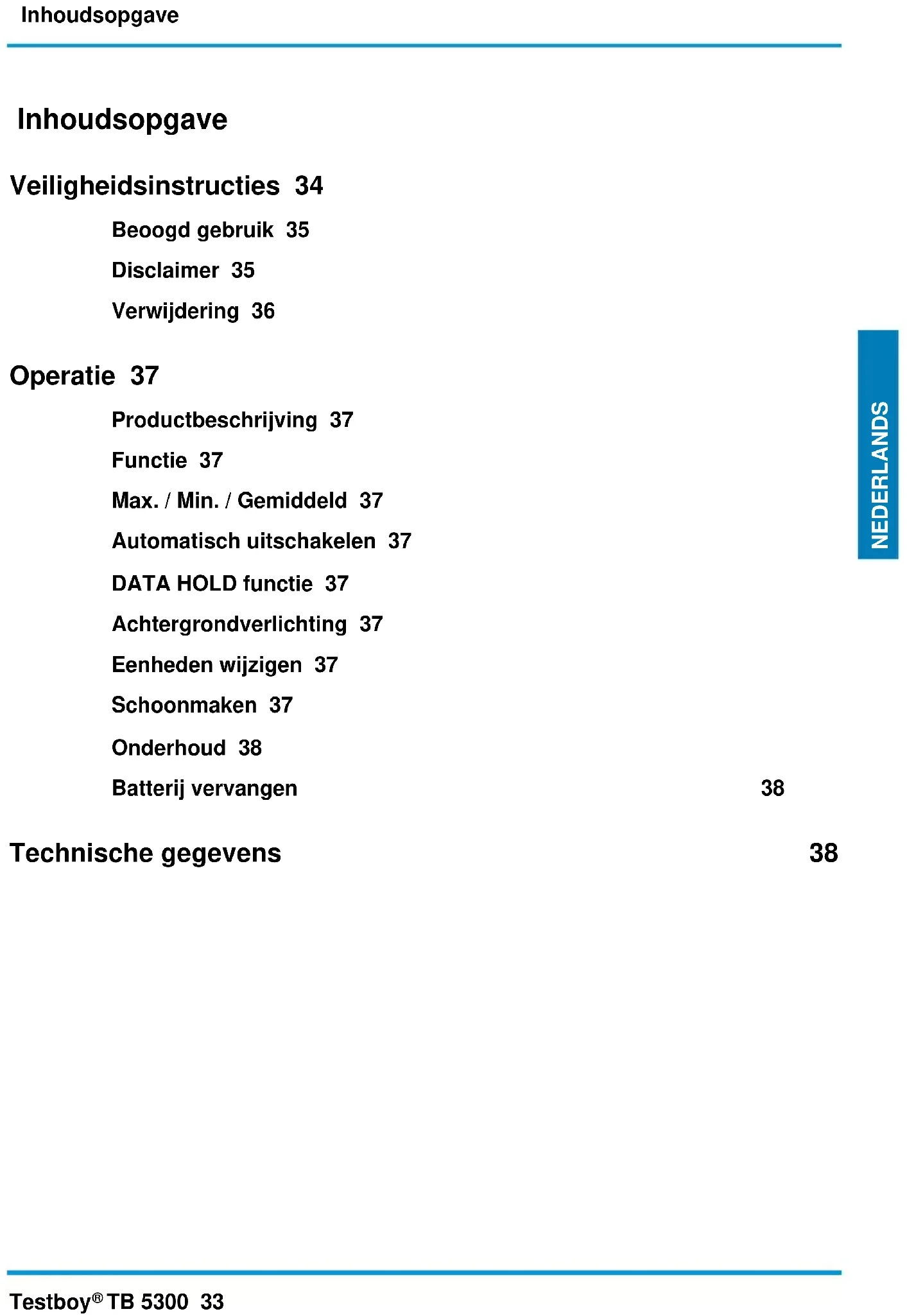 TB 5300 33 NEDERLANDS Inhoudsopgave Veiligheidsinstructies 34 Beoogd gebruik 35 Disclaimer 35 Verwijdering 36 Operatie 37 Productbeschrijving 37 Functie 37 Max. / Min. / Gemiddeld 37 Automatisch uitschakelen 37 DATA HOLD functie 37 Achtergrondverlichting 37 Eenheden wijzigen 37 Schoonmaken 37 Onderhoud 38 Batterij vervangen 38 Technische gegevens 38Veiligheidsinstructies 34 Testboy