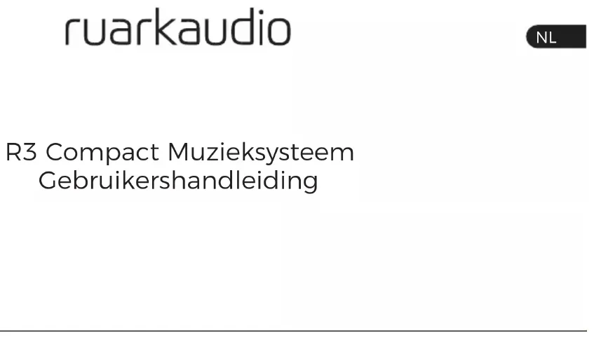 GebruikershandleidingVeiligheids- en regelgevende informatie ● Lees deze gebruikershandleiding en volg alle instructies, het zal u helpen bij het correct opstellen en bedienen van uw product. ● Let op alle waarschuwingen en bewaar deze gebruikershandleiding voor toekomstig gebruik. ● Probeer geen beschadigd apparaat te gebruiken daar dit zou kunnen resulteren in een gevaarlijke elektrische schok. ● De eenheid niet openen of ongeacht welke panelen verwijderen om de elektronica bloot te leggen. Geen interne onderdelen die door de gebruiker gerepareerd of onderhouden kunnen worden. ● Laat al het onderhoud over aan gekwaliceerd servicepersoneel. Onderhoud is nodig wanneer het apparaat op enige wijze is beschadigd, zoals het stroomvoorzieningssnoer of de stekker is beschadigd, er vloeistof is gemorst of voorwerpen in het apparaat zijn gevallen, het apparaat is blootgesteld aan regen of vocht, niet normaal werkt, of is gevallen. ● Dit apparaat is ALLEEN bedoeld voor bediening vanaf de AC- spanningen die op het paneel aan de achterkant worden vermeld of bijbehorende stroomvoorziening. Bediening vanuit andere spanningen dan de aangegeven kunnen onherstelbare schade aan het apparaat veroorzaken waardoor de productgarantie kan komen te vervallen. ● Controleer of de netstroomstekker of netstroomaansluiting in de eenheid gemakkelijk toegankelijk is in het geval dat loskoppeling van de netstroom nodig is. ● De netstroomadapter, netstroomstekker of netstroomaansluiting moet uit de contactdoos worden verwijderd om het systeem volledig los te koppelen van de netstroom. ● Plaats geen open vuurbronnen, zoals brandende kaarsen, op of bij het apparaat. Niet installeren in de buurt van warmtebronnen zoals radiatoren, kachels of andere apparaten, (inclusief versterkers) die warmte afgeven. ● Vermijd blootstelling aan extreme hitte of kou. ● Gebruik alleen voor dit apparaat gespeciceerde hulpstukken/ accessoires. Voer geen aanpassingen aan het systeem of de accessoires uit. Onbevoegde veranderingen kunnen de veiligheid, naleving van regels en prestatie van het systeem aantasten. ● Gebruik alleen de geleverde antenne of een goedgekeurde vervangende antenne. ● Om het risico op brand of elektrische schok te verminderen, het apparaat niet blootstellen aan regen of vocht. Dit apparaat niet blootstellen aan druppels of spetters en plaats geen met vloeistof gevulde voorwerpen, zoals vazen, op of bij het apparaat. Zoals met alle elektronische producten, pas op dat er in geen enkel deel van het systeem vloeistoffen worden gemorst. Vloeistoffen kunnen een defect en/of een brandgevaar veroorzaken. ● Neem de stekker van dit apparaat uit de contactdoos tijdens onweer of wanneer het gedurende lange tijd niet wordt gebruikt om schade aan dit apparaat te voorkomen. ● Om risico op brand of elektrische schok te voorkomen, vermijd overbelasting van wandcontactdozen, verlengsnoeren of integrale gemakscontactdozen. ● Langdurige blootstelling aan luide muziek kan gehoorbeschadiging veroorzaken. Het is het beste een extreem volume te vermijden bij gebruik van koptelefoons, met name gedurende langere perioden. ● Installeer dit apparaat niet in een besloten ruimte. Laat altijd een ruimte van ten minste 10 cm rond het apparaat open voor ventilatie en let op dat gordijnen of andere voorwerpen nooit ventilatie-openingen op het apparaat bedekken. Dit apparaat is gelabeld conform Europese Richtlijn 2012/19/ EU met betrekking tot elektrisch en elektronisch afval. Dit symbool geeft aan dat het product of bijbehorende batterijen niet als gewoon huishoudelijk afval mogen worden weggegooid. Zoals met alle elektrische apparatuur, weggooien volgens lokale voorschriften.NL CE-COMPLIANTIE-INFORMATIE Dit product voldoet aan alle vereisten uit de EU Richtlijn zoals wettelijk van toepassing. Ruark Audio verklaart hierbij dat dit apparaat voldoet aan de essentiële vereisten en andere relevante voorschriften van de Europese Richtlijn voor Radio-apparatuur 2014/53/EU. U kunt de volledige CE- Conformiteitsverklaring downloaden op www.ruarkaudio.com/doc/R3doc.pdf Specificaties Versterkers en drivers 2 x 75mm Ruark NS+ drivers 30W Klasse AB versterker Versterkte digitale 3D audioprocessor Tuner DAB, DAB+ en FM Tuner met RDS 75 Ohm F-type DAB/FM-antenne-invoer CD-speler CD, CD-ROM, CD-R/RW disks MP3, WMA, AAC 320kbps Digitaal audio Audioele 32-bits 112dB audiostereo DAC Internetradio, Spotify Connect, Amazon Music, Deezer, TIDAL, UPnP™ DLNA Wi-Fi 802.11b/g/n ondersteunt WEP, WPA & WPA2 veiligheid MP3 48kHz 320kbps, AAC 96kHz 320kbps, FLAC 24-bit 48kHz, WAV 16-bit 48kHz / 24 bit 44.1kHz, WMA 44.1kHz 320kbps Bluetooth: SBC, AAC, A2DP, aptX Ingangen en uitgangen Digitaal optisch (TOSLINK) 24-bit 192kHz Lijningang (RCA) 2.3Vrms Lijn uit (RCA) 2.0Vrms Ethernet (RJ45) USB 2.0, 5W (5V 1A) 3,5mm jack koptelefoonuitgang, 25mW 16-32 Ohm Vermogen Invoervermogen 100V-240V AC, 50-60 Hz 1A max Uitvoervermogen 14V DC 2.85A Nominaal verbruik: 5W Stand-by verbruik: 1.6W Batterijen voor afstandsbediening: 2 x 1.5V AAA Dimensies H167 x B420 x D220mm - 5.3kg Specicatie en ontwerp kunnen zonder mededeling worden aangepast. Ruark Audio aanvaardt geen verantwoordelijkheid voor mogelijke fouten in deze handleiding en de daarin opgenomen informatie kan zonder berichtgeving veranderen. Problemen oplossen Voor hulp met uw product, zie de bladzijde met FAQ (Regelmatig gestelde vragen) in het ondersteunende gebied van onze website. Voor meer informatie bezoekt u www.ruarkaudio.com/supportWat zit er in de doos Controleer of alle op de onderstaande lijst vermelde onderdelen in de doos zitten. Wanneer er een onderdeel ontbreekt, dient u de R3 niet te gebruiken en rechtstreeks contact met ons op te nemen wanneer hij in het VK werd aangeschaft of met uw Ruark Audio dealer wanneer hij buiten het VK werd gekocht.