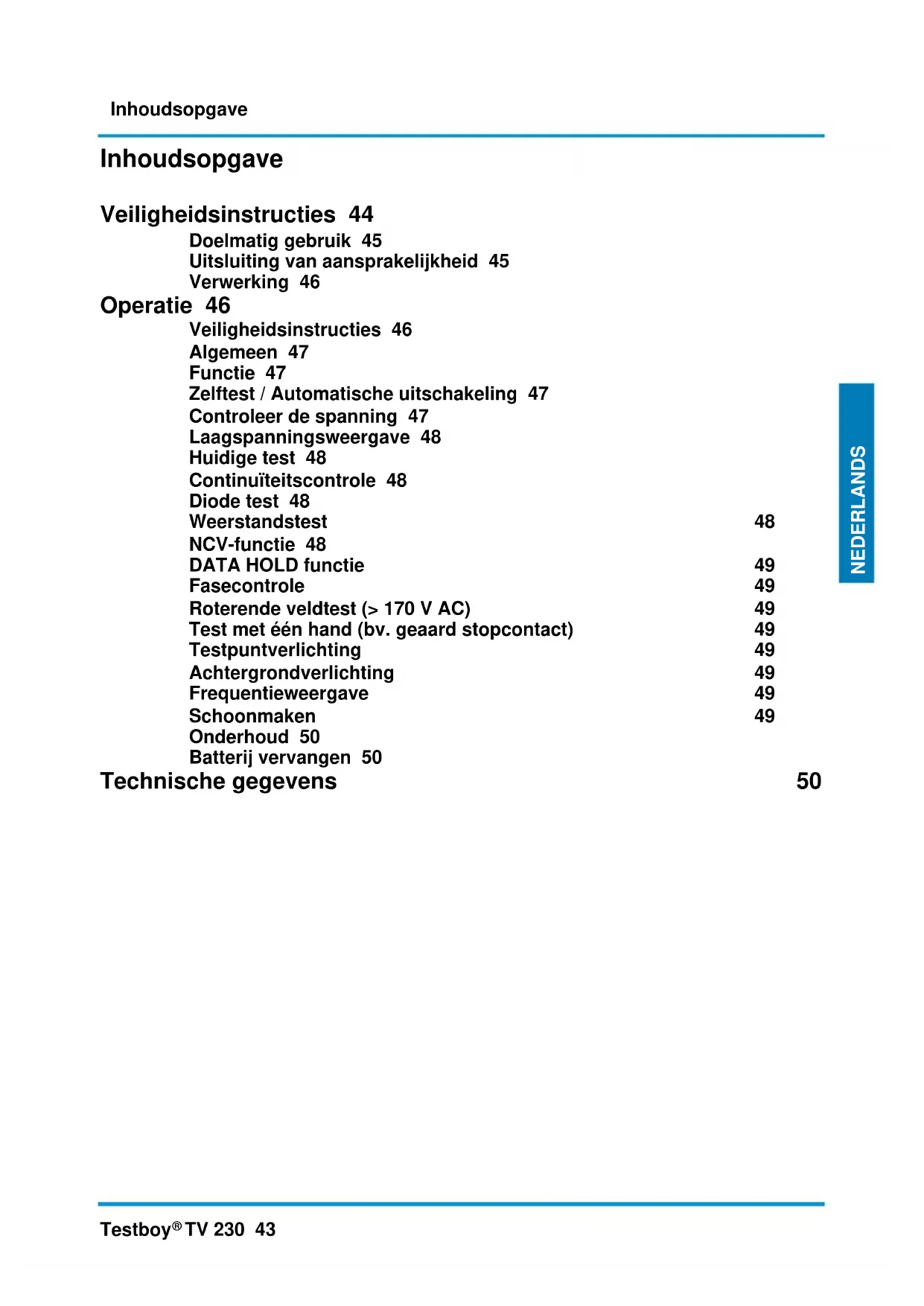 TV 230 43 NEDERLANDS Inhoudsopgave Veiligheidsinstructies 44 Doelmatig gebruik 45 Uitsluiting van aansprakelijkheid 45 Verwerking 46 Operatie 46 Veiligheidsinstructies 46 Algemeen 47 Functie 47 Zelftest / Automatische uitschakeling 47 Controleer de spanning 47 Laagspanningsweergave 48 Huidige test 48 Continuïteitscontrole 48 Diode test 48 Weerstandstest 48 NCV-functie 48 DATA HOLD functie 49 Fasecontrole 49 Roterende veldtest (> 170 V AC) 49 Test met één hand (bv. geaard stopcontact) 49 Testpuntverlichting 49 Achtergrondverlichting 49 Frequentieweergave 49 Schoonmaken 49 Onderhoud 50 Batterij vervangen 50 Technische gegevens 50Veiligheidsinstructies 44 Testboy