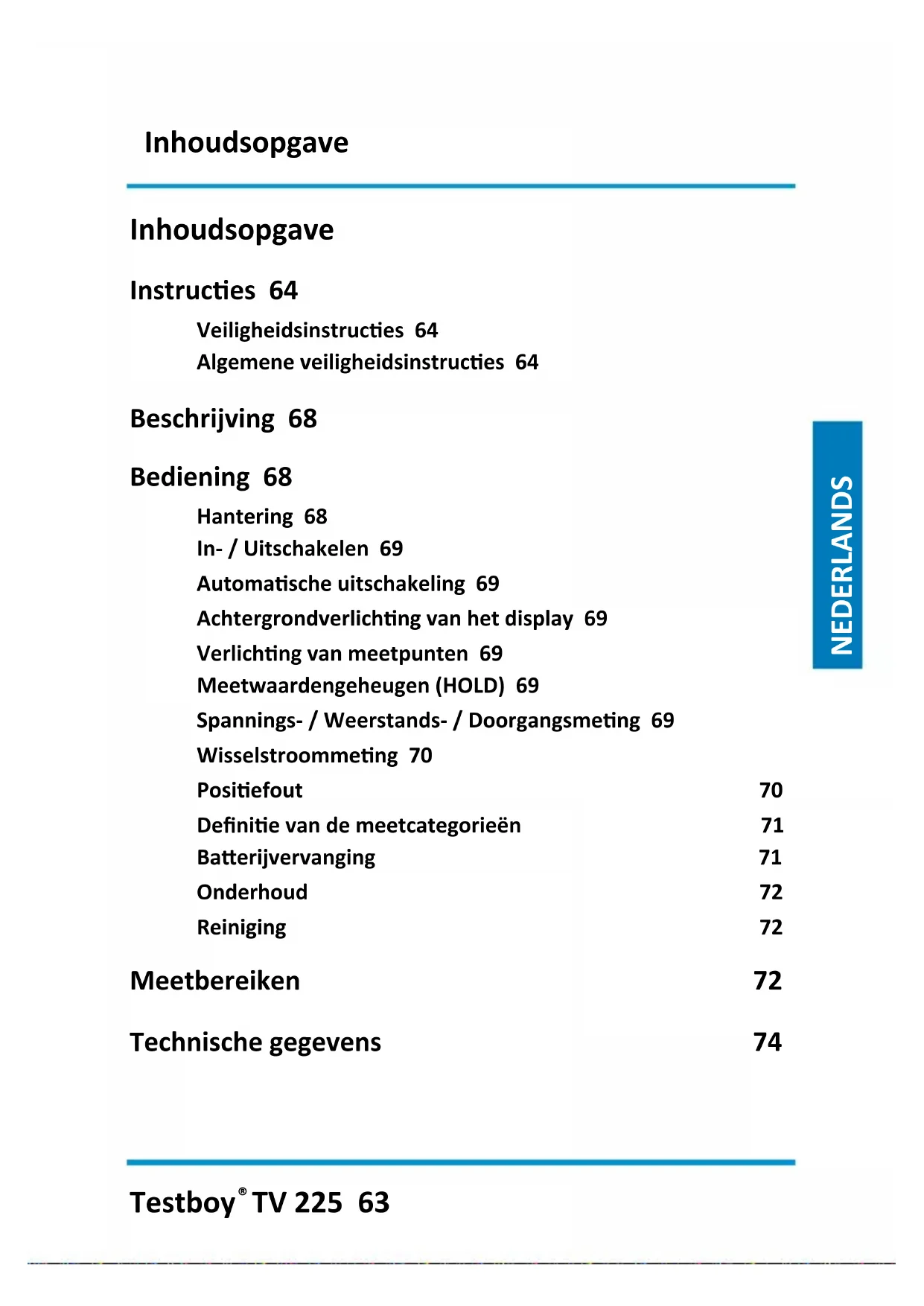 TV 225 63 ENGLISH NEDERLANDS NEDERLANDS Inhoudsopgave Instructies 64 Veiligheidsinstructies 64 Algemene veiligheidsinstructies 64 Beschrijving 68 Bediening 68 Hantering 68 In- / Uitschakelen 69 Automatische uitschakeling 69 Achtergrondverlichting van het display 69 Verlichting van meetpunten 69 Meetwaardengeheugen (HOLD) 69 Spannings- / Weerstands- / Doorgangsmeting 69 Wisselstroommeting 70 Positiefout 70 Definitie van de meetcategorieën 71 Batterijvervanging 71 Onderhoud 72 Reiniging 72 Meetbereiken 72 Technische gegevens 74Instructies 64 Testboy