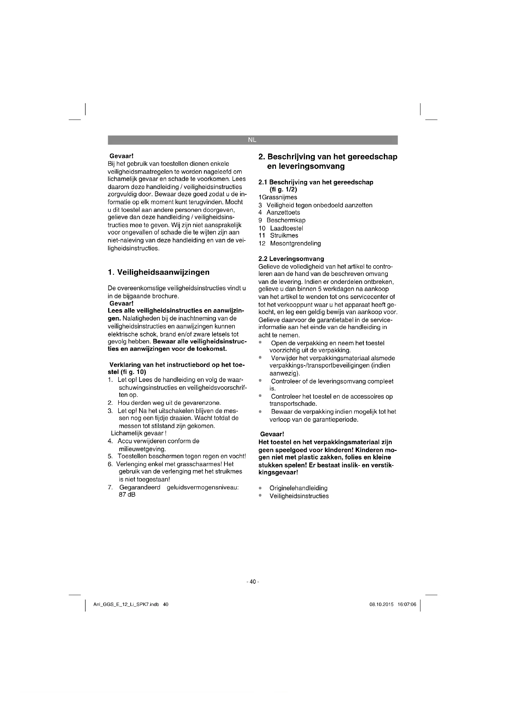 Het toestel bevindt zich in een verpakking om transportschade te voorkomen. Deze verpakking is een grondstof en bijgevolg herbruikbaar of kan de grondstofkringloop terug worden ingebracht. Het toestel en zijn accessoires bestaan uit di- verse materialen, zoals b.v. metaal en kunststof. Ontdoet u zich van defecte onderdelen op de inzamelplaats waar u gevaarlijke afvalstoff en mag afgeven. Informeer u in uw speciaalzaak of bij uw gemeentebestuur! Anl_GGS_E_12_Li_SPK7.indb 43Anl_GGS_E_12_Li_SPK7.indb 43 08.10.2015 16:07:0708.10.2015 16:07:07NL