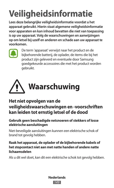 Veiligheidsinformatie Lees deze belangrijke veiligheidsinformatie voordat u het apparaat gebruikt. Hierin staat algemene veiligheidsinformatie voor apparaten en kan inhoud bevatten die niet van toepassing is op uw apparaat. Volg de waarschuwingen en aanwijzingen op om letsel bij uzelf en anderen en schade aan uw apparaat te voorkomen. De term 'apparaat' verwijst naar het product en de bijbehorende batterij, de oplader, de items die bij het product zijn geleverd en eventuele door Samsung goedgekeurde accessoires die met het product worden gebruikt.