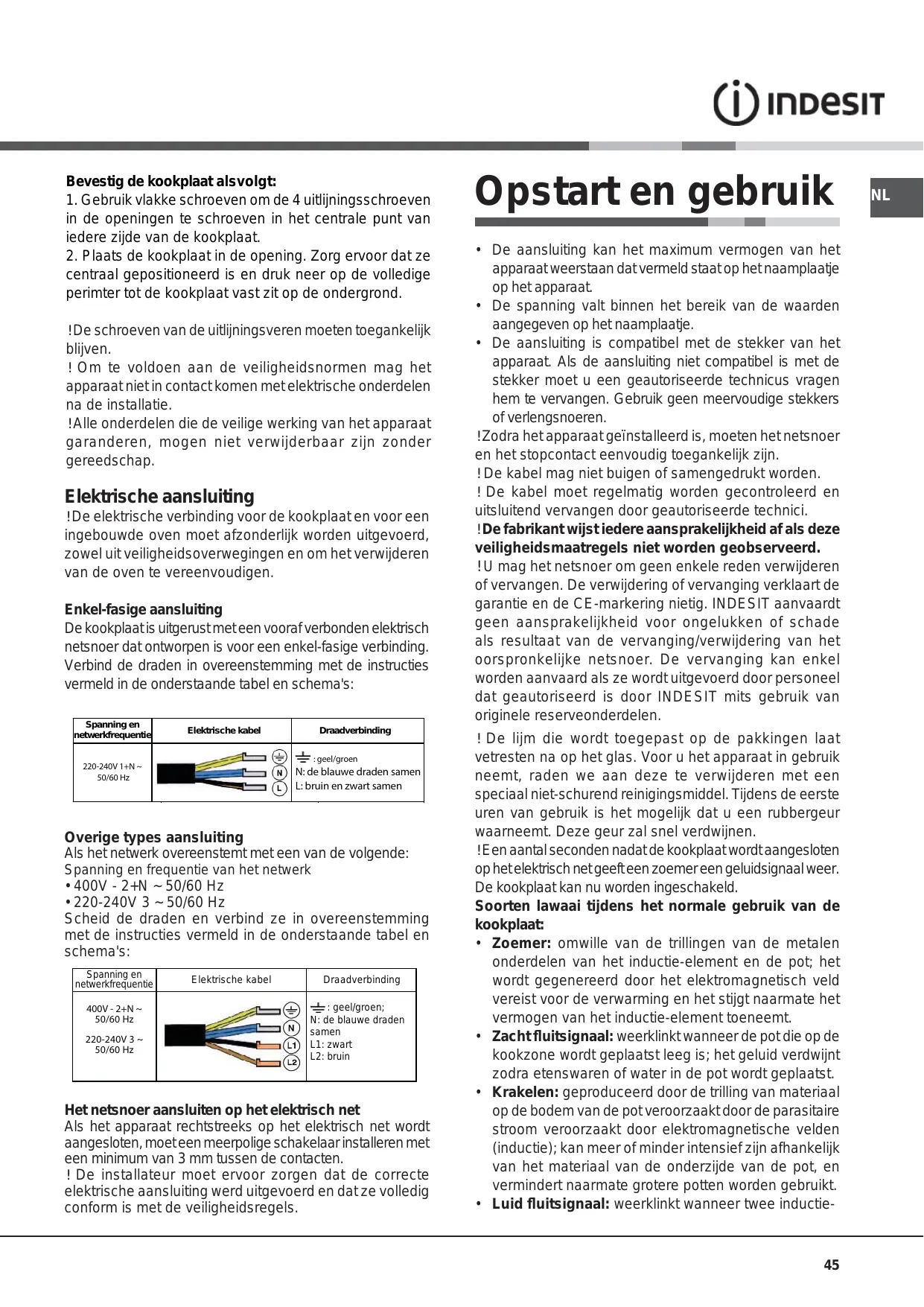 ! Con el fin de adherirse a las normas de seguridad, • La tensión cae dentro del rango de los valores indicados en la placa de datos. • La toma es compatible con el enchufe del aparato. Si la toma es incompatible con el enchufe, pida a un técnico autorizado que lo reemplace. No utilice cables alargadores ni conexiones múltiples. ! Una vez que el aparato ha sido instalado, el cable de alimentación y la toma de corriente deben ser fácilmente accesibles. ! El cable no debe sufrir pliegues ni compresiones. ! El cable debe ser revisado periódicamente y sustituido sólo por técnicos autorizados. ! La empresa declina toda responsabilidad en que no hayan sido respetadas estas normas. ! No retire o sustituya el cable de suministro de energía por ningún motivo. Su eliminación o sustitución, anulará la garantía y el marcado CE. INDESIT no asume ninguna responsabilidad por accidentes y daños derivados de la sustitución / eliminación del cable de alimentación original. • Silbido suave: se escucha cuando la olla colocada en la zona de calentamiento está vacía; el ruido desaparece una vez que la comida o el agua se colocan en la olla. • Crepitar: producido por la vibración de los materiales en la parte inferior de la olla debido al flujo de corrientes parasitarias causadas por los campos electromagnéticos (inducción); puede ser más o menos intensa dependiendo del material que constituye el fondo de la olla, y disminuye a medida que aumentan las dimensiones de la olla.