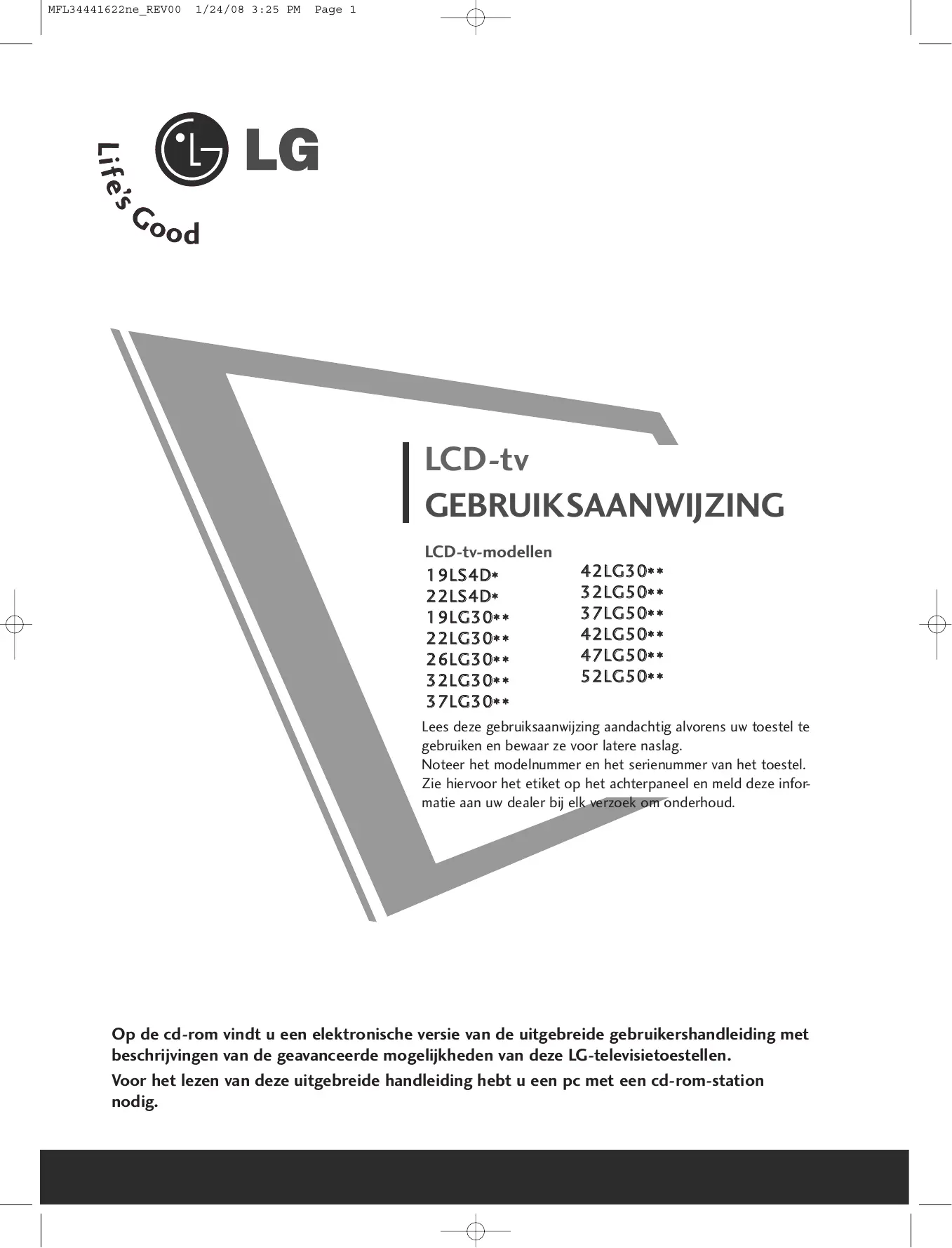 Download de handleiding voor uw Televisie in PDF-formaat gratis! Vind uw handleiding 325600.AEU - LG en neem uw elektronisch apparaat weer in handen. Op deze pagina staan alle documenten die nodig zijn voor het gebruik van uw apparaat. 325600.AEU van het merk LG.
