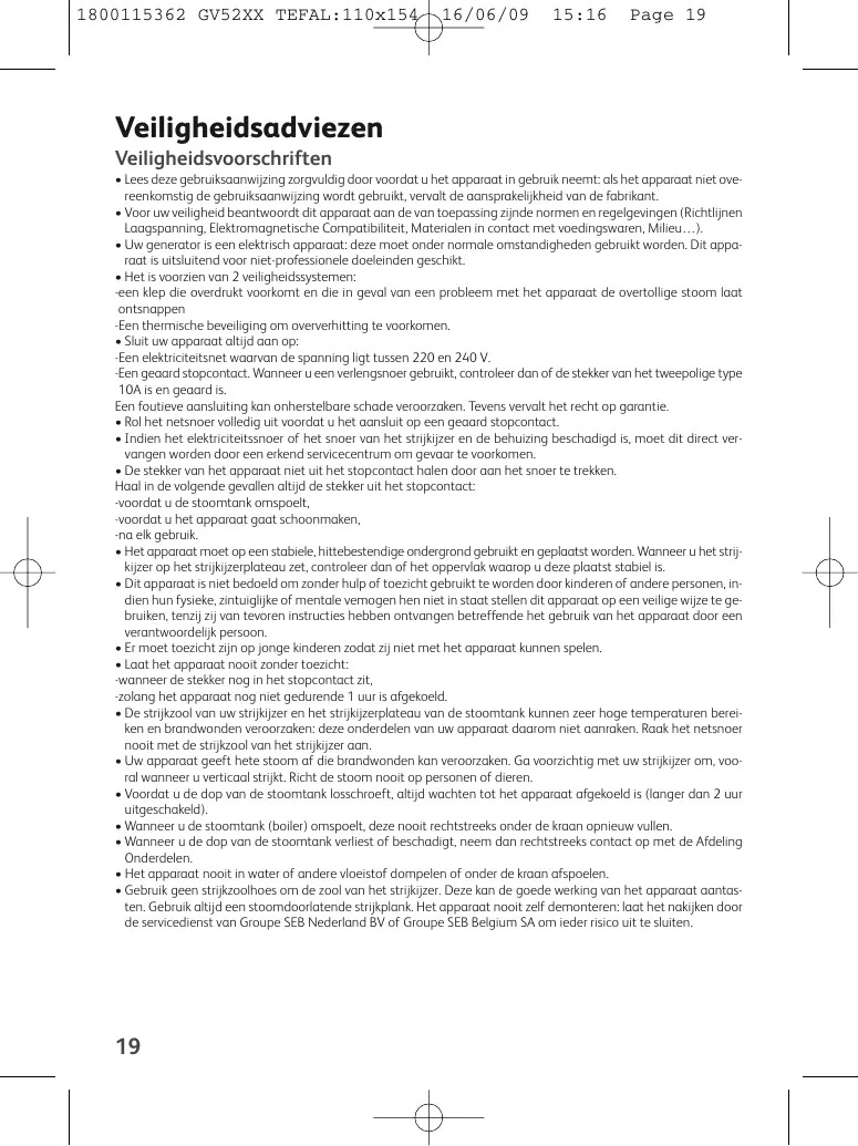 Veiligheidsadviezen Veiligheidsvoorschriften • Lees deze gebruiksaanwijzing zorgvuldig door voordat u het apparaat in gebruik neemt: als het apparaat niet overeenkomstig de gebruiksaanwijzing wordt gebruikt, vervalt de aansprakelijkheid van de fabrikant. • Voor uw veiligheid beantwoordt dit apparaat aan de van toepassing zijnde normen en regelgevingen (Richtlijnen Laagspanning, Elektromagnetische Compatibiliteit, Materialen in contact met voedingswaren, Milieu…). • Uw generator is een elektrisch apparaat: deze moet onder normale omstandigheden gebruikt worden. Dit apparaat is uitsluitend voor niet-professionele doeleinden geschikt. • Het is voorzien van 2 veiligheidssystemen: -een klep die overdrukt voorkomt en die in geval van een probleem met het apparaat de overtollige stoom laat ontsnappen -Een thermische beveiliging om oververhitting te voorkomen. • Sluit uw apparaat altijd aan op: -Een elektriciteitsnet waarvan de spanning ligt tussen 220 en 240 V. -Een geaard stopcontact. Wanneer u een verlengsnoer gebruikt, controleer dan of de stekker van het tweepolige type 10A is en geaard is. Een foutieve aansluiting kan onherstelbare schade veroorzaken. Tevens vervalt het recht op garantie. • Rol het netsnoer volledig uit voordat u het aansluit op een geaard stopcontact. • Indien het elektriciteitssnoer of het snoer van het strijkijzer en de behuizing beschadigd is, moet dit direct vervangen worden door een erkend servicecentrum om gevaar te voorkomen. • De stekker van het apparaat niet uit het stopcontact halen door aan het snoer te trekken. Haal in de volgende gevallen altijd de stekker uit het stopcontact: -voordat u de stoomtank omspoelt, -voordat u het apparaat gaat schoonmaken, -na elk gebruik. • Het apparaat moet op een stabiele, hittebestendige ondergrond gebruikt en geplaatst worden. Wanneer u het strijkijzer op het strijkijzerplateau zet, controleer dan of het oppervlak waarop u deze plaatst stabiel is. • Dit apparaat is niet bedoeld om zonder hulp of toezicht gebruikt te worden door kinderen of andere personen, indien hun fysieke, zintuiglijke of mentale vemogen hen niet in staat stellen dit apparaat op een veilige wijze te gebruiken, tenzij zij van tevoren instructies hebben ontvangen betreffende het gebruik van het apparaat door een verantwoordelijk persoon. • Er moet toezicht zijn op jonge kinderen zodat zij niet met het apparaat kunnen spelen. • Laat het apparaat nooit zonder toezicht: -wanneer de stekker nog in het stopcontact zit, -zolang het apparaat nog niet gedurende 1 uur is afgekoeld. • De strijkzool van uw strijkijzer en het strijkijzerplateau van de stoomtank kunnen zeer hoge temperaturen bereiken en brandwonden veroorzaken: deze onderdelen van uw apparaat daarom niet aanraken. Raak het netsnoer nooit met de strijkzool van het strijkijzer aan. • Uw apparaat geeft hete stoom af die brandwonden kan veroorzaken. Ga voorzichtig met uw strijkijzer om, vooral wanneer u verticaal strijkt. Richt de stoom nooit op personen of dieren. • Voordat u de dop van de stoomtank losschroeft, altijd wachten tot het apparaat afgekoeld is (langer dan 2 uur uitgeschakeld). • Wanneer u de stoomtank (boiler) omspoelt, deze nooit rechtstreeks onder de kraan opnieuw vullen. • Wanneer u de dop van de stoomtank verliest of beschadigt, neem dan rechtstreeks contact op met de Afdeling Onderdelen. • Het apparaat nooit in water of andere vloeistof dompelen of onder de kraan afspoelen. • Gebruik geen strijkzoolhoes om de zool van het strijkijzer. Deze kan de goede werking van het apparaat aantasten. Gebruik altijd een stoomdoorlatende strijkplank. Het apparaat nooit zelf demonteren: laat het nakijken door de servicedienst van Groupe SEB Nederland BV of Groupe SEB Belgium SA om ieder risico uit te sluiten.