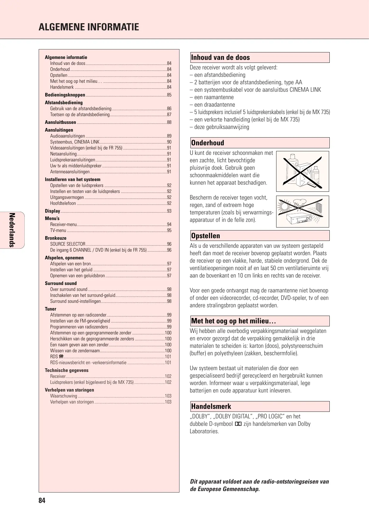 "DOLBY", "DOLBY DIGITAL", "PRO LOGIC" en het dubbele D-symbolo 00 zijn handelsmerken van Dolby Laboratories.