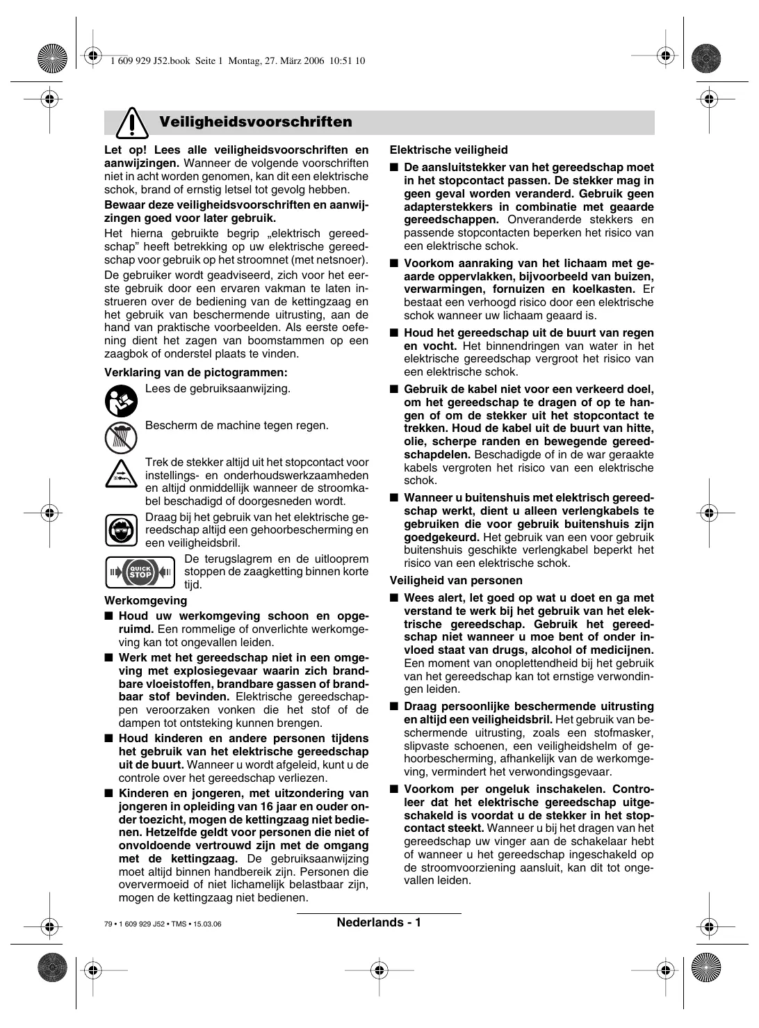 ............................................................... 0 44 / 8 47 15 13 Fax ............................................................... 0 44 / 8 47 15 53 78 • 1 609 929 J52 • TMS • 15.03.06 Dr. Eckerhard Strötgen Head of Product Certification Con riserva di modifiche Italiano - 13 1 609 929 J52.book Seite 1 Montag, 27. März 2006 10:51 10 Veiligheidsvoorschriften Let op! Lees alle veiligheidsvoorschriften en aanwijzingen. Wanneer de volgende voorschriften niet in acht worden genomen, kan dit een elektrische schok, brand of ernstig letsel tot gevolg hebben. Bewaar deze veiligheidsvoorschriften en aanwijzingen goed voor later gebruik. Het hierna gebruikte begrip „elektrisch gereedschap” heeft betrekking op uw elektrische gereedschap voor gebruik op het stroomnet (met netsnoer). De gebruiker wordt geadviseerd, zich voor het eerste gebruik door een ervaren vakman te laten instrueren over de bediening van de kettingzaag en het gebruik van beschermende uitrusting, aan de hand van praktische voorbeelden. Als eerste oefening dient het zagen van boomstammen op een zaagbok of onderstel plaats te vinden. Verklaring van de pictogrammen: Lees de gebruiksaanwijzing. Bescherm de machine tegen regen. Trek de stekker altijd uit het stopcontact voor instellings- en onderhoudswerkzaamheden en altijd onmiddellijk wanneer de stroomkabel beschadigd of doorgesneden wordt. Draag bij het gebruik van het elektrische gereedschap altijd een gehoorbescherming en een veiligheidsbril. De terugslagrem en de uitlooprem stoppen de zaagketting binnen korte tijd. Werkomgeving ■ Houd uw werkomgeving schoon en opgeruimd. Een rommelige of onverlichte werkomgeving kan tot ongevallen leiden. ■ Werk met het gereedschap niet in een omgeving met explosiegevaar waarin zich brandbare vloeistoffen, brandbare gassen of brandbaar stof bevinden. Elektrische gereedschappen veroorzaken vonken die het stof of de dampen tot ontsteking kunnen brengen. ■ Houd kinderen en andere personen tijdens het gebruik van het elektrische gereedschap uit de buurt. Wanneer u wordt afgeleid, kunt u de controle over het gereedschap verliezen. ■ Kinderen en jongeren, met uitzondering van jongeren in opleiding van 16 jaar en ouder onder toezicht, mogen de kettingzaag niet bedienen. Hetzelfde geldt voor personen die niet of onvoldoende vertrouwd zijn met de omgang met de kettingzaag. De gebruiksaanwijzing moet altijd binnen handbereik zijn. Personen die oververmoeid of niet lichamelijk belastbaar zijn, mogen de kettingzaag niet bedienen. 79 • 1 609 929 J52 • TMS • 15.03.06 Elektrische veiligheid ■ De aansluitstekker van het gereedschap moet in het stopcontact passen. De stekker mag in geen geval worden veranderd. Gebruik geen adapterstekkers in combinatie met geaarde gereedschappen. Onveranderde stekkers en passende stopcontacten beperken het risico van een elektrische schok. ■ Voorkom aanraking van het lichaam met geaarde oppervlakken, bijvoorbeeld van buizen, verwarmingen, fornuizen en koelkasten. Er bestaat een verhoogd risico door een elektrische schok wanneer uw lichaam geaard is. ■ Houd het gereedschap uit de buurt van regen en vocht. Het binnendringen van water in het elektrische gereedschap vergroot het risico van een elektrische schok. ■ Gebruik de kabel niet voor een verkeerd doel, om het gereedschap te dragen of op te hangen of om de stekker uit het stopcontact te trekken. Houd de kabel uit de buurt van hitte, olie, scherpe randen en bewegende gereedschapdelen. Beschadigde of in de war geraakte kabels vergroten het risico van een elektrische schok. ■ Wanneer u buitenshuis met elektrisch gereedschap werkt, dient u alleen verlengkabels te gebruiken die voor gebruik buitenshuis zijn goedgekeurd. Het gebruik van een voor gebruik buitenshuis geschikte verlengkabel beperkt het risico van een elektrische schok. Veiligheid van personen ■ Wees alert, let goed op wat u doet en ga met verstand te werk bij het gebruik van het elektrische gereedschap. Gebruik het gereedschap niet wanneer u moe bent of onder invloed staat van drugs, alcohol of medicijnen. Een moment van onoplettendheid bij het gebruik van het gereedschap kan tot ernstige verwondingen leiden. ■ Draag persoonlijke beschermende uitrusting en altijd een veiligheidsbril. Het gebruik van beschermende uitrusting, zoals een stofmasker, slipvaste schoenen, een veiligheidshelm of gehoorbescherming, afhankelijk van de werkomgeving, vermindert het verwondingsgevaar. ■ Voorkom per ongeluk inschakelen. Controleer dat het elektrische gereedschap uitgeschakeld is voordat u de stekker in het stopcontact steekt. Wanneer u bij het dragen van het gereedschap uw vinger aan de schakelaar hebt of wanneer u het gereedschap ingeschakeld op de stroomvoorziening aansluit, kan dit tot ongevallen leiden. Nederlands - 1 1 609 929 J52.book Seite 2 Montag, 27. März 2006 10:51 10 ■ Verwijder instelgereedschappen of schroefsleutels voordat u het gereedschap inschakelt. Een instelgereedschap of sleutel in een draaiend deel van het gereedschap kan tot verwondingen leiden. ■ Overschat uzelf niet. Zorg ervoor dat u stevig staat en steeds in evenwicht blijft. Daardoor kunt u het gereedschap in onverwachte situaties beter onder controle houden. ■ Draag geschikte kleding. Draag geen loshangende kleding of sieraden. Houd haren, kleding en handschoenen uit de buurt van bewegende delen. Loshangende kleding, lange haren en sieraden kunnen door bewegende delen worden meegenomen. ■ Wanneer stofafzuigings- of stofopvangvoorzieningen kunnen worden gemonteerd, dient u zich ervan te verzekeren dat deze zijn aangesloten en juist worden gebruikt. Het gebruik van deze voorzieningen beperkt het gevaar door stof. Zorgvuldige omgang met en zorgvuldig gebruik van elektrische gereedschappen ■ Overbelast het gereedschap niet. Gebruik voor uw werkzaamheden het daarvoor bestemde elektrische gereedschap. Met het passende elektrische gereedschap werkt u beter en veiliger binnen het aangegeven ca
