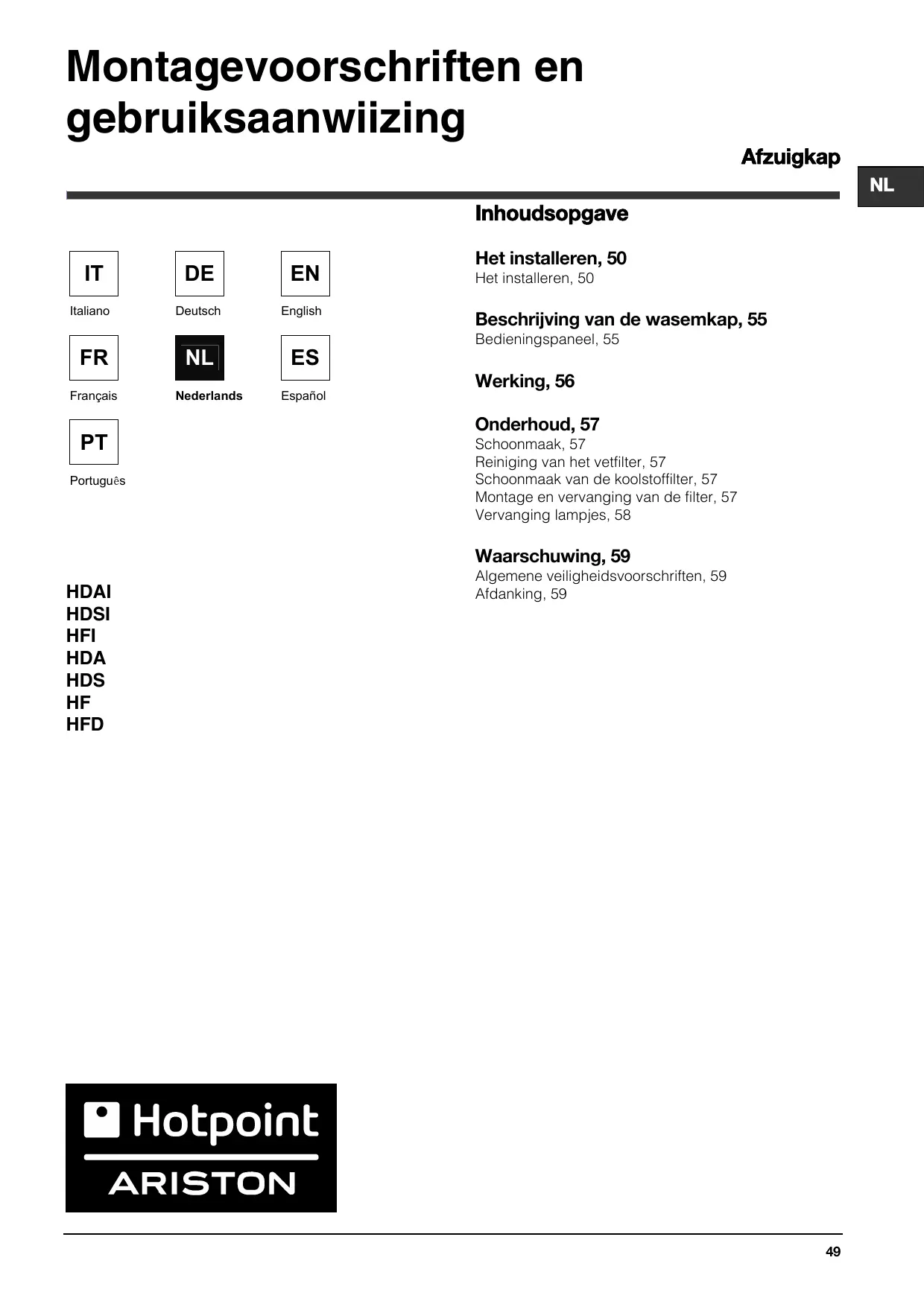 Download de handleiding voor uw Keukenafzuigkap in PDF-formaat gratis! Vind uw handleiding HHE 90 F HA IX - HOTPOINT en neem uw elektronisch apparaat weer in handen. Op deze pagina staan alle documenten die nodig zijn voor het gebruik van uw apparaat. HHE 90 F HA IX van het merk HOTPOINT.