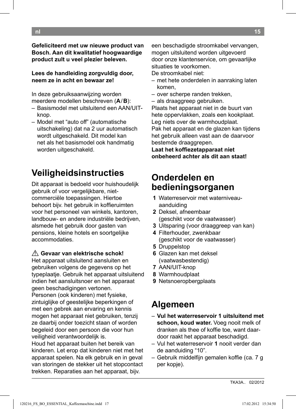 – Während des Brühvorgangs darf die Glaskanne 6 nicht herausgenommen werden, da der Filterhalter 4 überlaufen kann. – Glaskanne 6 nur mit geschlossenem Deckel in das Gerät stellen. – Andere Kannen dürfen nicht verwendet werden, sonst verhindert der spezielle Das Gerät brüht auffällig langsamer oder schaltet vor Beendigung des Brühvorgangs ab. Congratulations on purchasing this Bosch appliance. You have acquired a high-quality product that will bring you a lot of enjoyment. Please read the operating instructions carefully and keep them for future reference! hese operating instructions describe the following different models (A / B): en de ● Press the ON/OFF switch 7 to start the brewing cycle. Note: The “auto off” model has an auto off (energy-saving) program that switches the appliance off after approximately two hours. Important: When the brewing process is complete, wait a moment until all the coffee has run through the ilter and into the carafe. Let the machine cool down for ive minutes before brewing a fresh pot. Ce mode d’emploi décrit des modèles différents (A / B) : – Modèle de base, uniquement avec bouton Marche/Arrêt – Modèle « auto off » qui s’arrête automatiquement après 2 heures. Il peut également être arrêté manuellement comme le modèle de base.