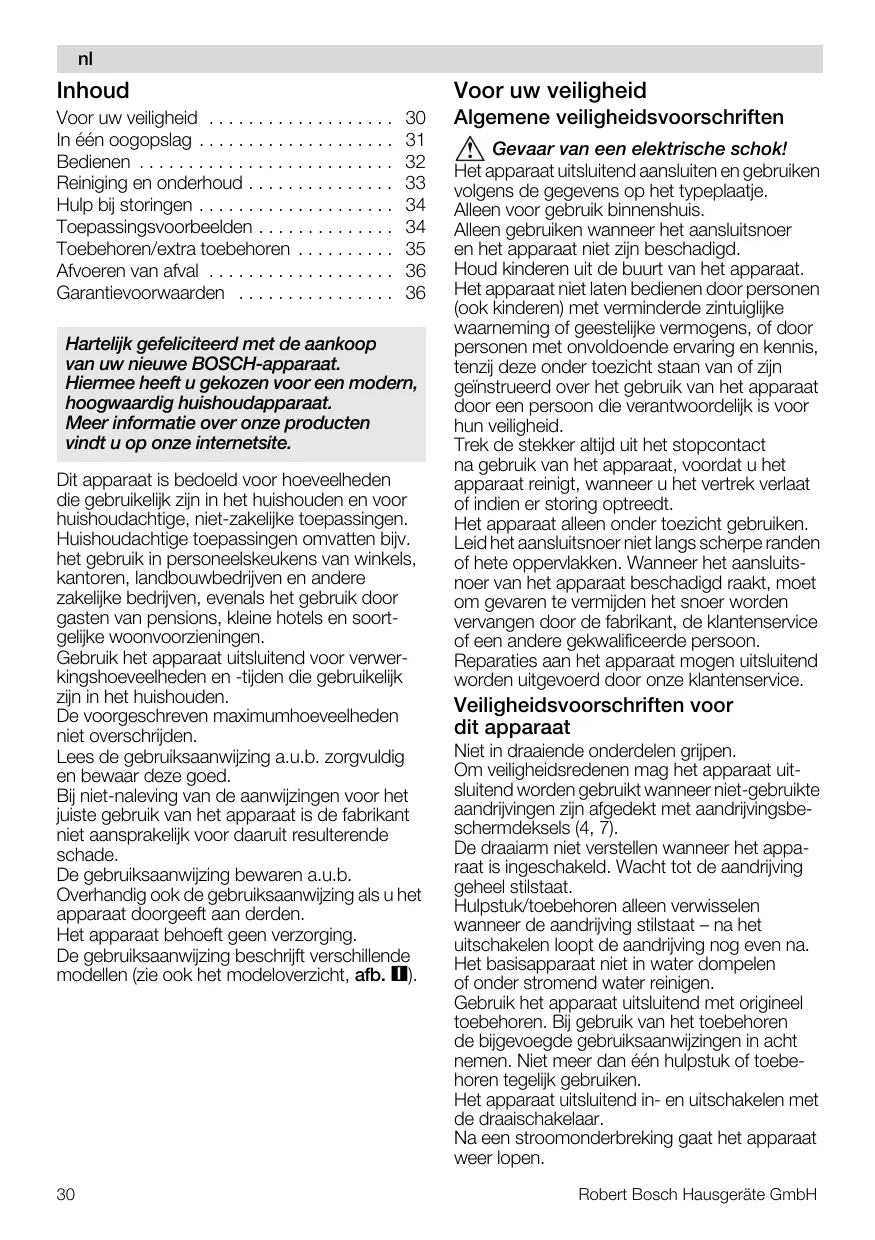 Algemene veiligheidsvoorschriften dÉî~~ê=î~å=ÉÉå=ÉäÉâíêáëÅÜÉ=ëÅÜçâ> Het apparaat uitsluitend aansluiten en gebruiken volgens de gegevens op het typeplaatje. Alleen voor gebruik binnenshuis. Alleen gebruiken wanneer het aansluitsnoer en het apparaat niet zijn beschadigd. Houd kinderen uit de buurt van het apparaat. Het apparaat niet laten bedienen door personen (ook kinderen) met verminderde zintuiglijke waarneming of geestelijke vermogens, of door personen met onvoldoende ervaring en kennis, tenzij deze onder toezicht staan van of zijn geïnstrueerd over het gebruik van het apparaat door een persoon die verantwoordelijk is voor hun veiligheid. Trek de stekker altijd uit het stopcontact na gebruik van het apparaat, voordat u het apparaat reinigt, wanneer u het vertrek verlaat of indien er storing optreedt. Het apparaat alleen onder toezicht gebruiken. Leid het aansluitsnoer niet langs scherpe randen of hete oppervlakken. Wanneer het aansluitsnoer van het apparaat beschadigd raakt, moet om gevaren te vermijden het snoer worden vervangen door de fabrikant, de klantenservice of een andere gekwalificeerde persoon. Reparaties aan het apparaat mogen uitsluitend worden uitgevoerd door onze klantenservice. Veiligheidsvoorschriften voor dit apparaat Niet in draaiende onderdelen grijpen. Om veiligheidsredenen mag het apparaat uitsluitend worden gebruikt wanneer niet-gebruikte aandrijvingen zijn afgedekt met aandrijvingsbeschermdeksels (4, 7). De draaiarm niet verstellen wanneer het apparaat is ingeschakeld. Wacht tot de aandrijving geheel stilstaat. Hulpstuk/toebehoren alleen verwisselen wanneer de aandrijving stilstaat – na het uitschakelen loopt de aandrijving nog even na. Het basisapparaat niet in water dompelen of onder stromend water reinigen. Gebruik het apparaat uitsluitend met origineel toebehoren. Bij gebruik van het toebehoren de bijgevoegde gebruiksaanwijzingen in acht nemen. Niet meer dan één hulpstuk of toebehoren tegelijk gebruiken. Het apparaat uitsluitend in- en uitschakelen met de draaischakelaar. Na een stroomonderbreking gaat het apparaat weer lopen. Robert Bosch Hausgeräte GmbH