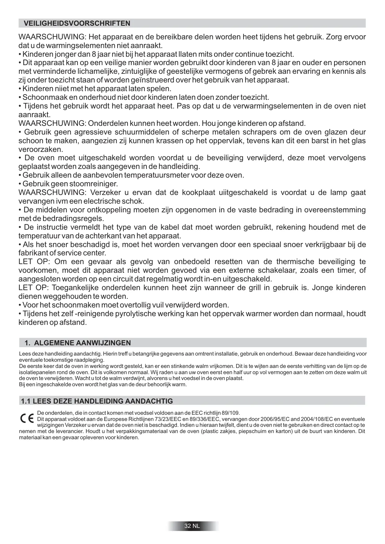 Lees deze handleiding aandachtig. Hierin treff u betangrijke gegevens aan omtrent installatie, gebruik en onderhoud. Bewaar deze handleiding voor eventuele toekomstige raadpleging. De eerste keer dat de oven in werking wordt gesteld, kan er een stinkende walm vrijkomen. Dit is te wijten aan de eerste verhitting van de lijm op de isolatiepanelen rond de oven. Dit is volkomen normaal. Wij raden u aan uw oven eerst een half uur op vol vermogen aan te zetten om deze walm uit de oven te verwijderen. Wacht u tot de walm verdwijnt, alvorens u het voedsel in de oven plaatst. Bij een ingeschakelde oven wordt het glas van de deur behoorlijk warm.