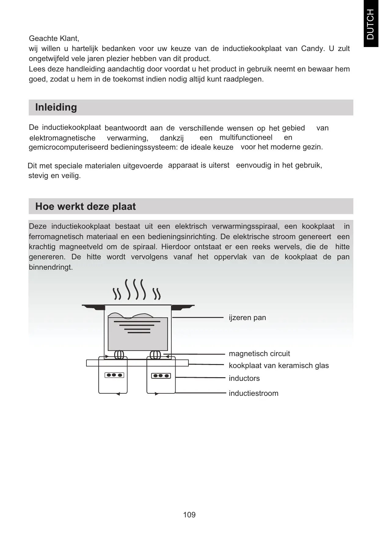 DUTCH Geachte Klant, wij willen u hartelijk bedanken voor uw keuze van de inductiekookplaat van Candy. U zult ongetwijfeld vele jaren plezier hebben van dit product. Lees deze handleiding aandachtig door voordat u het product in gebruik neemt en bewaar hem goed, zodat u hem in de toekomst indien nodig altijd kunt raadplegen. Veiligheid Installatie Installatieprocedure