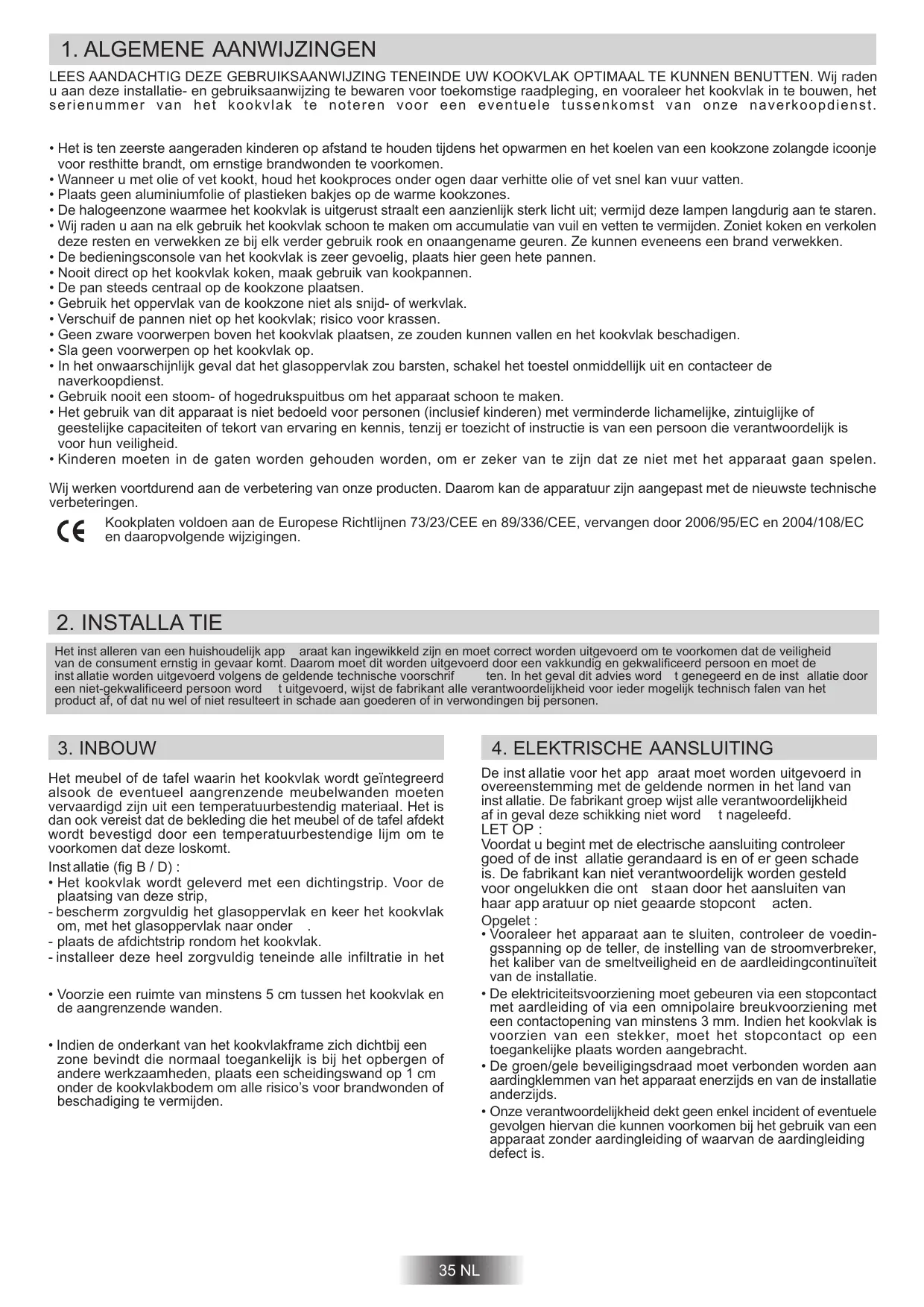 - Kinderen moeten in de gaten worden gehouden worden, om er zeker van te zijn dat ze niet met het apparaat gaan spelen. Wij werken voortdurend aan de verbetering van onze producten. Daarom kan de apparatuur zijn aangepast met de nieuwste technische verbeteringen. Kookplaten voldoen aan de Europese Richtlijnen 73/23/CEE en 89/336/CEE, vervangen door 2006/95/EC en 2004/108/EC en daaropvolgende wijzigingen.