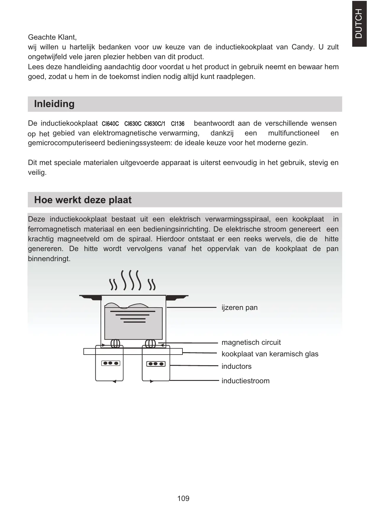 DUTCH Geachte Klant, wij willen u hartelijk bedanken voor uw keuze van de inductiekookplaat van Candy. U zult ongetwijfeld vele jaren plezier hebben van dit product. Lees deze handleiding aandachtig door voordat u het product in gebruik neemt en bewaar hem goed, zodat u hem in de toekomst indien nodig altijd kunt raadplegen.