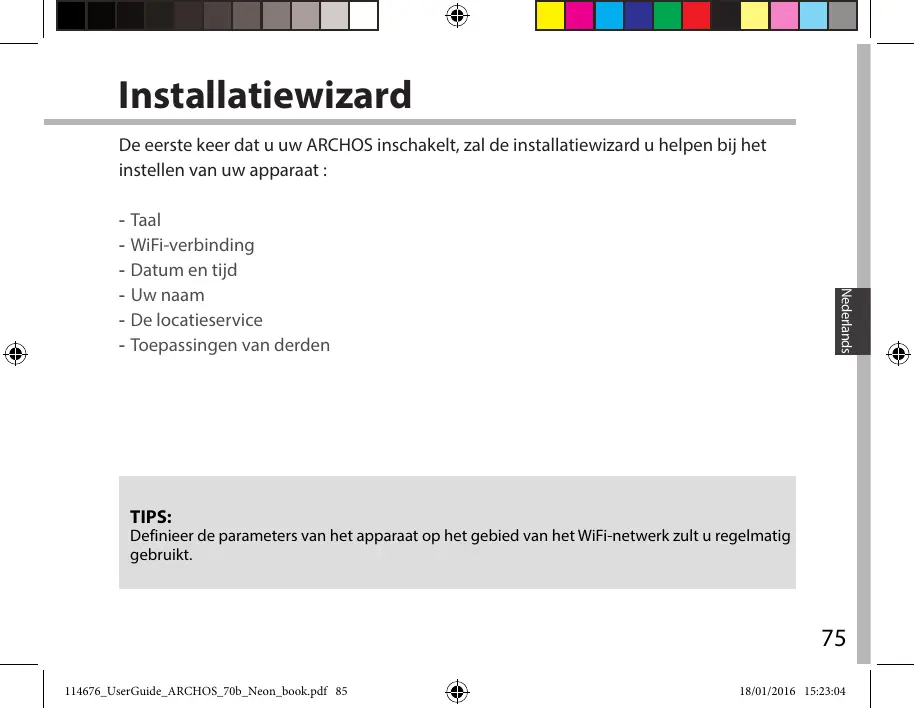 114676_UserGuide_ARCHOS_70b_Neon_book.pdf 84 18/01/2016 15:23:04 Installatiewizard De eerste keer dat u uw ARCHOS inschakelt, zal de installatiewizard u helpen bij het instellen van uw apparaat : Nederlands -- Taal -- WiFi-verbinding -- Datum en tijd -- Uw naam -- De locatieservice -- Toepassingen van derden TIPS: Definieer de parameters van het apparaat op het gebied van het WiFi-netwerk zult u regelmatig gebruikt.