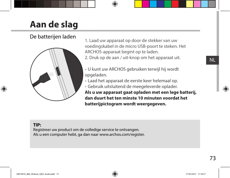 -- U kunt uw ARCHOS gebruiken terwijl hij wordt opgeladen. -- Laad het apparaat de eerste keer helemaal op. -- Gebruik uitsluitend de meegeleverde oplader. Als u uw apparaat gaat opladen met een lege batterij, dan duurt het ten minste 10 minuten voordat het batterijpictogram wordt weergegeven. TIP: Registreer uw product om de volledige service te ontvangen. Als u een computer hebt, ga dan naar www.archos.com/register.