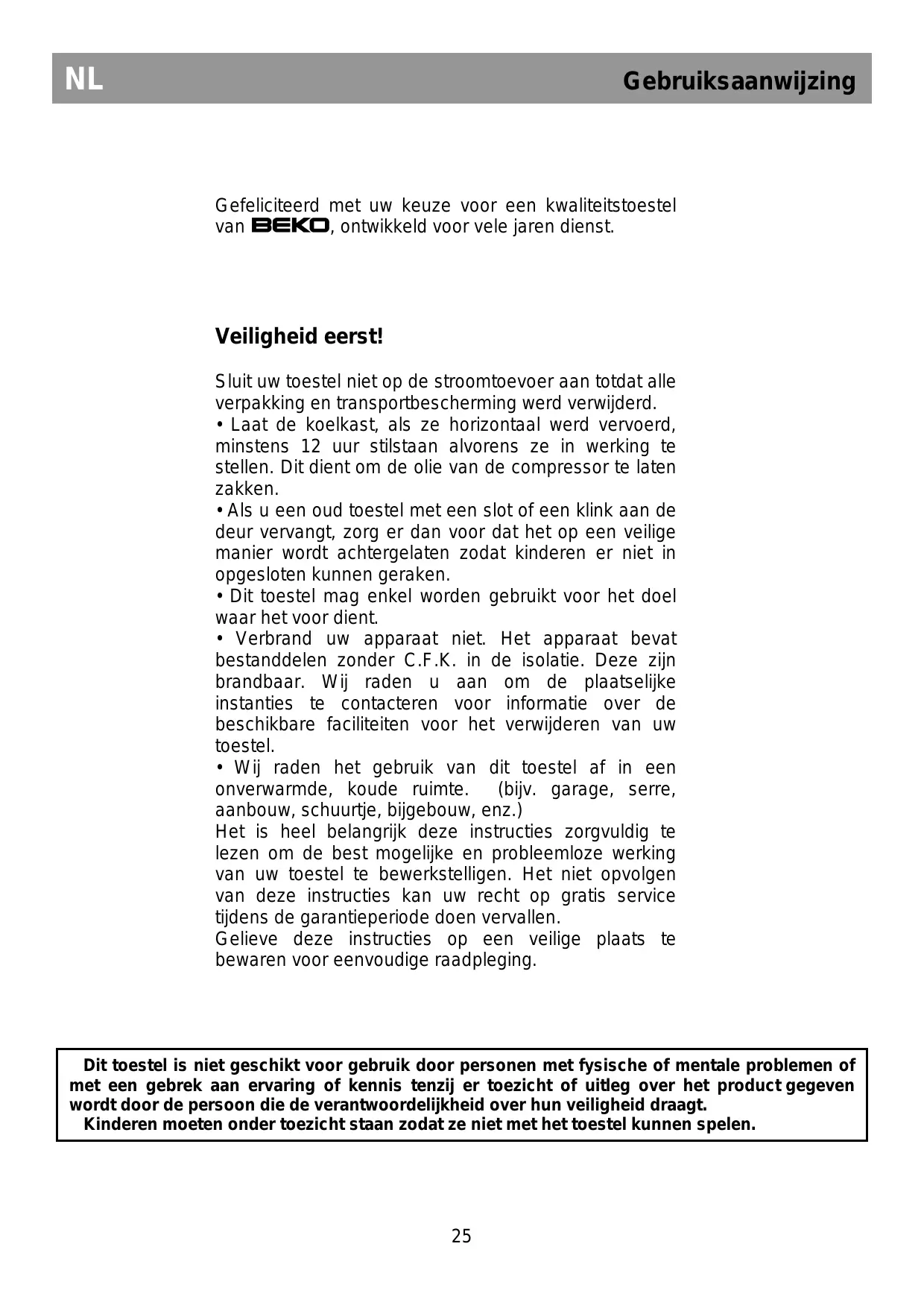 Dit toestel is niet geschikt voor gebruik door personen met fysische of mentale problemen of met een gebrek aan ervaring of kennis tenzij er toezicht of uitleg over het product gegeven wordt door de persoon die de verantwoordelijkheid over hun veiligheid draagt. Kinderen moeten onder toezicht staan zodat ze niet met het toestel kunnen spelen.