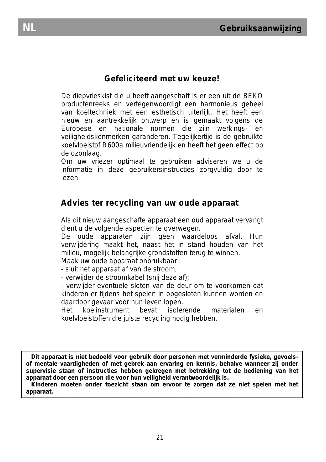 Gebruiksaanwijzing Gefeliciteerd met uw keuze! De diepvrieskist die u heeft aangeschaft is er een uit de BEKO productenreeks en vertegenwoordigt een harmonieus geheel van koeltechniek met een esthetisch uiterlijk. Het heeft een nieuw en aantrekkelijk ontwerp en is gemaakt volgens de Europese en nationale normen die zijn werkings- en veiligheidskenmerken garanderen. Tegelijkertijd is de gebruikte koelvloeistof R600a milieuvriendelijk en heeft het geen effect op de ozonlaag. Om uw vriezer optimaal te gebruiken adviseren we u de informatie in deze gebruikersinstructies zorgvuldig door te lezen. Advies ter recycling van uw oude apparaat Als dit nieuw aangeschafte apparaat een oud apparaat vervangt dient u de volgende aspecten te overwegen. De oude apparaten zijn geen waardeloos afval. Hun verwijdering maakt het, naast het in stand houden van het milieu, mogelijk belangrijke grondstoffen terug te winnen. Maak uw oude apparaat onbruikbaar : - sluit het apparaat af van de stroom; - verwijder de stroomkabel (snij deze af); - verwijder eventuele sloten van de deur om te voorkomen dat kinderen er tijdens het spelen in opgesloten kunnen worden en daardoor gevaar voor hun leven lopen. Het koelinstrument bevat isolerende materialen en koelvloeistoffen die juiste recycling nodig hebben. Dit apparaat is niet bedoeld voor gebruik door personen met verminderde fysieke, gevoelsof mentale vaardigheden of met gebrek aan ervaring en kennis, behalve wanneer zij onder supervisie staan of instructies hebben gekregen met betrekking tot de bediening van het apparaat door een persoon die voor hun veiligheid verantwoordelijk is. Kinderen moeten onder toezicht staan om ervoor te zorgen dat ze niet spelen met het apparaat.