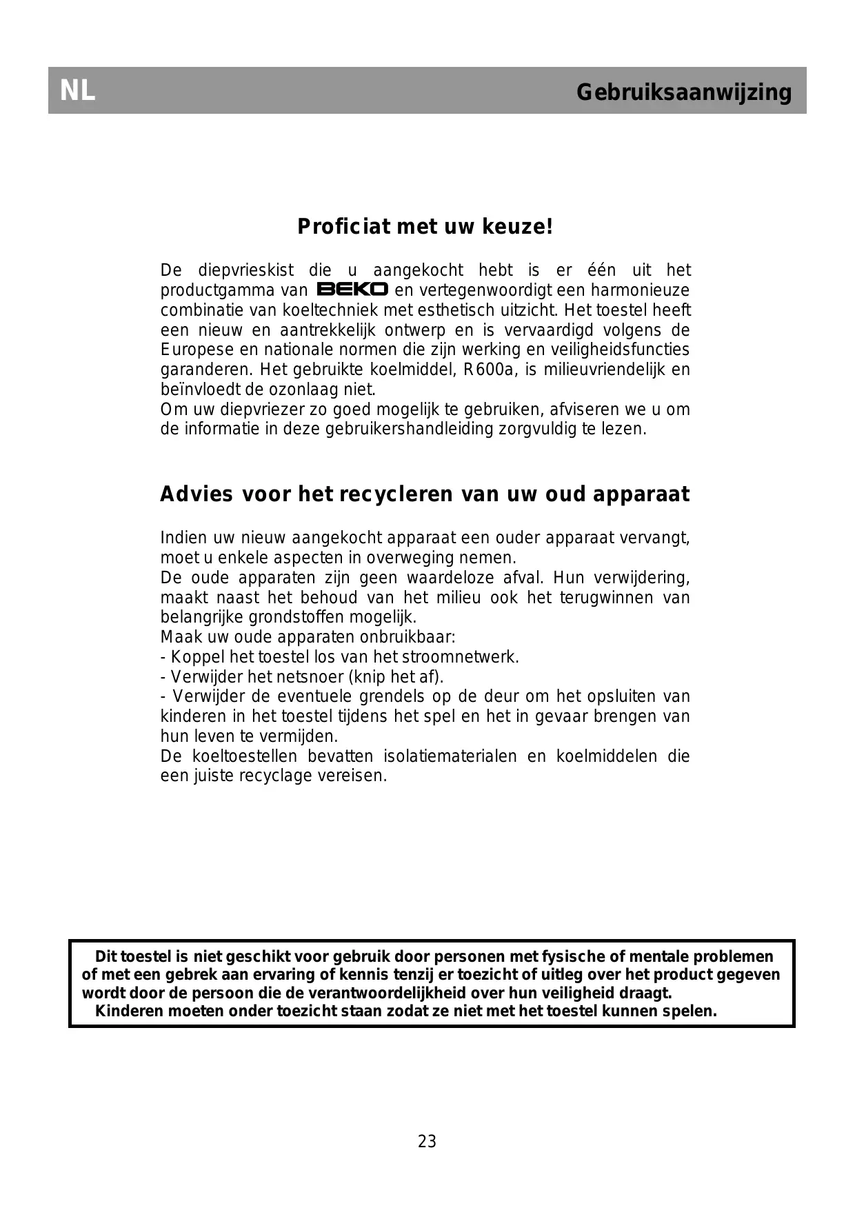 Cet appareil ne sera pas utilisé par des personnes ayant capacites physiques, sensorielles ou mentales réduites, ou sans experience concernant l'utilisation de l'appareil, si une personne responsable de leur sécurité ne les a pas instruites pour ce but.