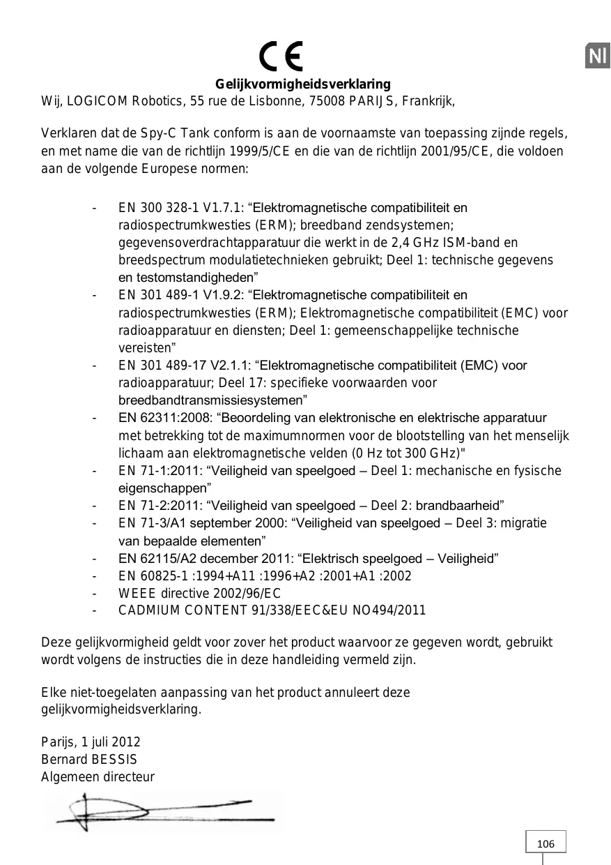 Gelijkvormigheidsverklaring Wij, LOGICOM Robotics, 55 rue de Lisbonne, 75008 PARIJS, Frankrijk, Verklaren dat de Spy-C Tank conform is aan de voornaamste van toepassing zijnde regels, en met name die van de richtlijn 1999/5/CE en die van de richtlijn 2001/95/CE, die voldoen aan de volgende Europese normen: -