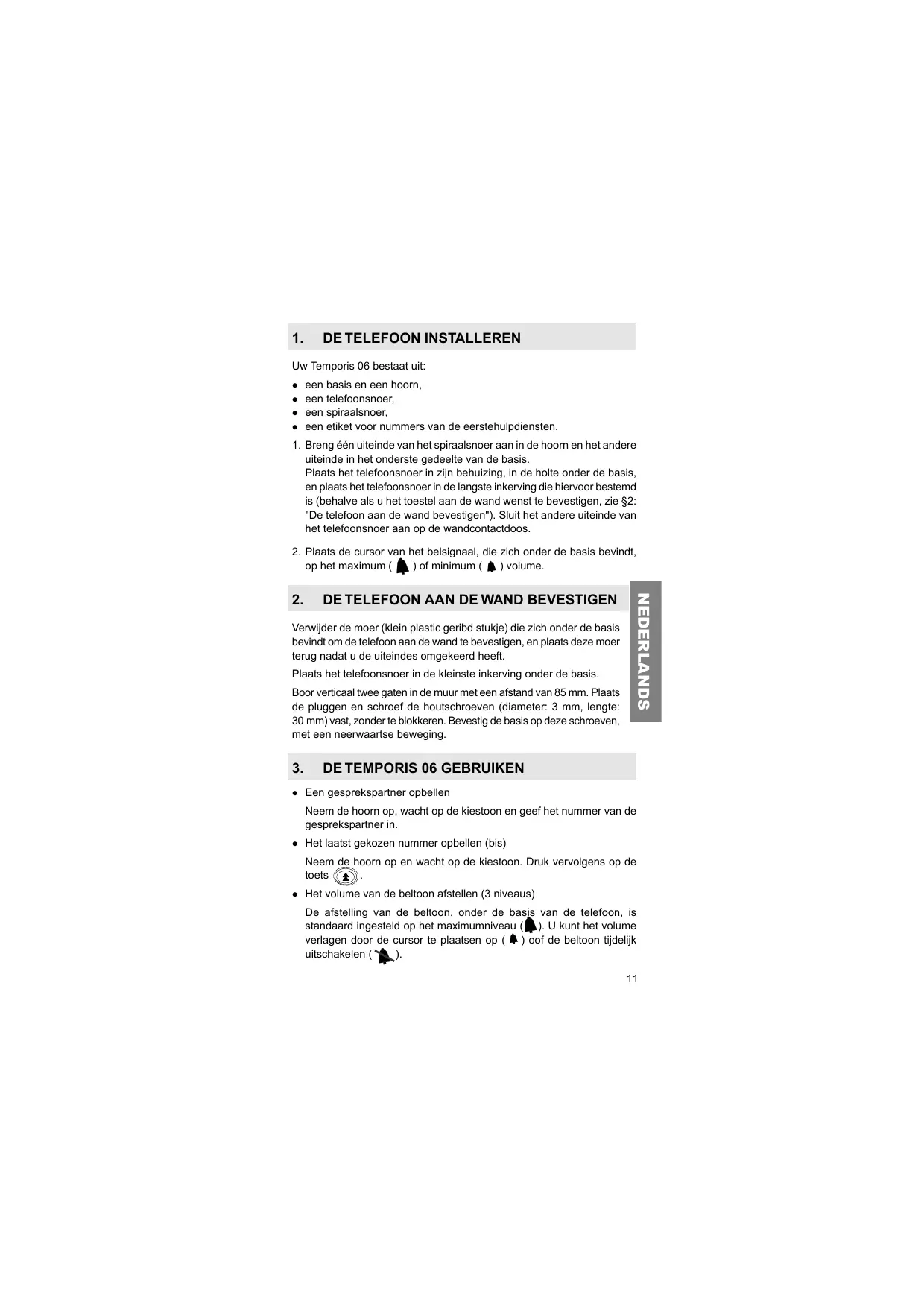 1. Breng één uiteinde van het spiraalsnoer aan in de hoorn en het andere uiteinde in het onderste gedeelte van de basis. Plaats het telefoonsnoer in zijn behuizing, in de holte onder de basis, en plaats het telefoonsnoer in de langste inkerving die hiervoor bestemd is (behalve als u het toestel aan de wand wenst te bevestigen, zie §2: "De telefoon aan de wand bevestigen"). Sluit het andere uiteinde van het telefoonsnoer aan op de wandcontactdoos. 2. Plaats de cursor van het belsignaal, die zich onder de basis bevindt, op het maximum ( ) of minimum ( ) volume.