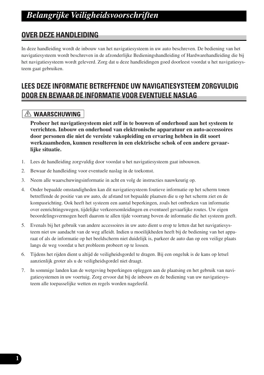 In deze handleiding wordt de inbouw van het navigatiesysteem in uw auto beschreven. De bediening van het navigatiesysteem wordt beschreven in de afzonderlijke Bedieningshandieiding of Hardwarehandleiding die bij het navigatiesysteem wordt geleverd. Zorg dat u deze handleidingen goed doorleest voordat u het navigatiesy teem gaat gebruiken. LEES DEZE INFORMATIE BETREFFENDE UW NAVIGATIESYSTEEM ZORGVULDIG DOOR EN BEWAAR DE INFORMATIE VOOR EVENTUELE NASLAG WAARSCHUWING Probeer het navigatiesysteem niet zelf in te bouwen of onderhoud aan het systeem te verrichten. Inbouw en onderhoud van elektronische apparatuur en auto-accessoires door personen die niet de vereiste vakopleiding en ervaring hebben in dit soort werkzaamheden, kunnen resulteren in een elektrische schok of een andere gevaar- lijke situatie.