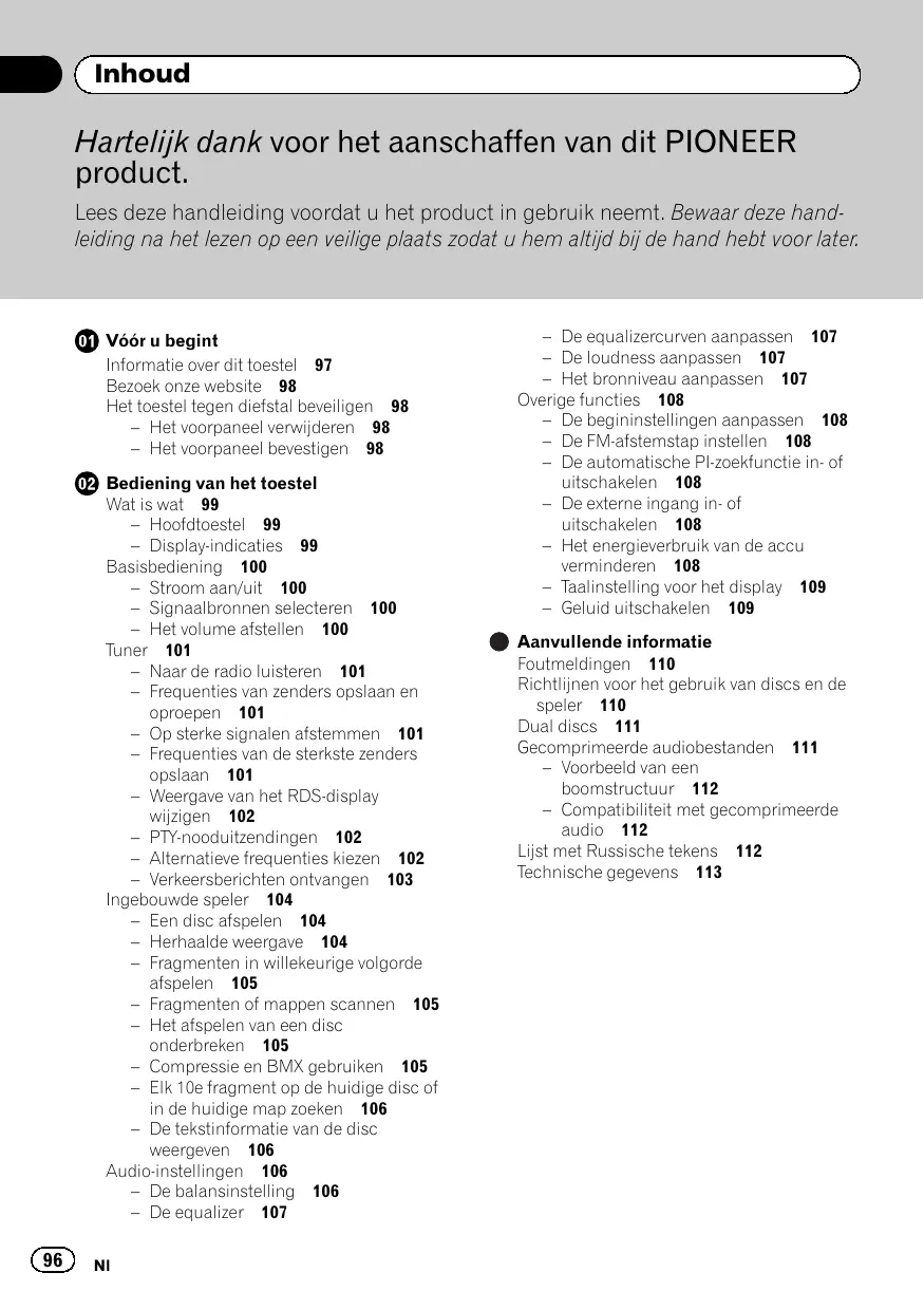 _) (Inhoud Hartelijk dank voor het aanschaffen van dit PIONEER product. Lees deze handleiding voordat u het product in gebruik neemt. Bewaar deze hand- leiding na het lezen op een veilige plaats zodat u hem altijd bij de hand hebt voor later. @® vér u begint Informatie over dit toestel 97 Bezoek onze website 98 Het toestel tegen diefstal beveiligen 98 — Het voorpaneel verwideren 98 — Het voorpaneel bevestigen 98 @ Bediening van het toestel Watis wat 99 — Hoofdtoestel 99 — Display-indicaties 99 Basisbediening 100 — Stroom aan/uit 100 — Signaalbronnen selecteren 100 — Het volume afstellen 100 Tuner 101 — Naar de radio luisteren 101 Frequenties van zenders opslaan en oproepen 101 Op sterke signalen afstemmen 101 — Frequenties van de sterkste zenders opslaan 101 — Weergave van het RDS-display wijzigen 102 — PTfnooduitzendingen 102 — Altemnatieve frequenties kiezen 102 — Verkeersberichten ontvangen 103 Ingebouwde speler 104 — Een disc afspelen 104 — Herhaalde weergave 104 — Fragmenten in willekeurige volgorde afspelen 105 Fragmenten of mappen scannen 105 Het afspelen van een disc onderbreken 105 — Compressie en BMX gebruiken 105 — Elk 10e fragment op de huidige disc of in de huidige map zoeken 106 De tekstinformatie van de disc weergeven 106 Audic-instellingen 106 — De balansinstelling 106 — Deequalizer 107 — De equalizercurven aanpassen 107 — De loudness aanpassen 107 — Het bronniveau aanpassen 107 Overige functies 108 — De begininstellingen aanpassen 108 — De FMafstemstap instellen 108 — De automatische Pl-zoekfunctie in- of uitschakelen 108 — De externe ingang in- of uitschakelen 108 — Het energieverbruik van de accu verminderen 108 — Taalinstelling voor het display 109 — Geluid uitschakelen 109 @ Aanvullende informatie Foutmeldingen 110 Richtlinen voor het gebruik van discs en de speler 110 Dual dises 111 Gecomprimeerde audiobestanden 111 — Voorbeeld van een boomstructuur 112 — Compätibiliteit met gecomprimeerde audio 112 Lijst met Russische tekens 112 Technische gegevens 113