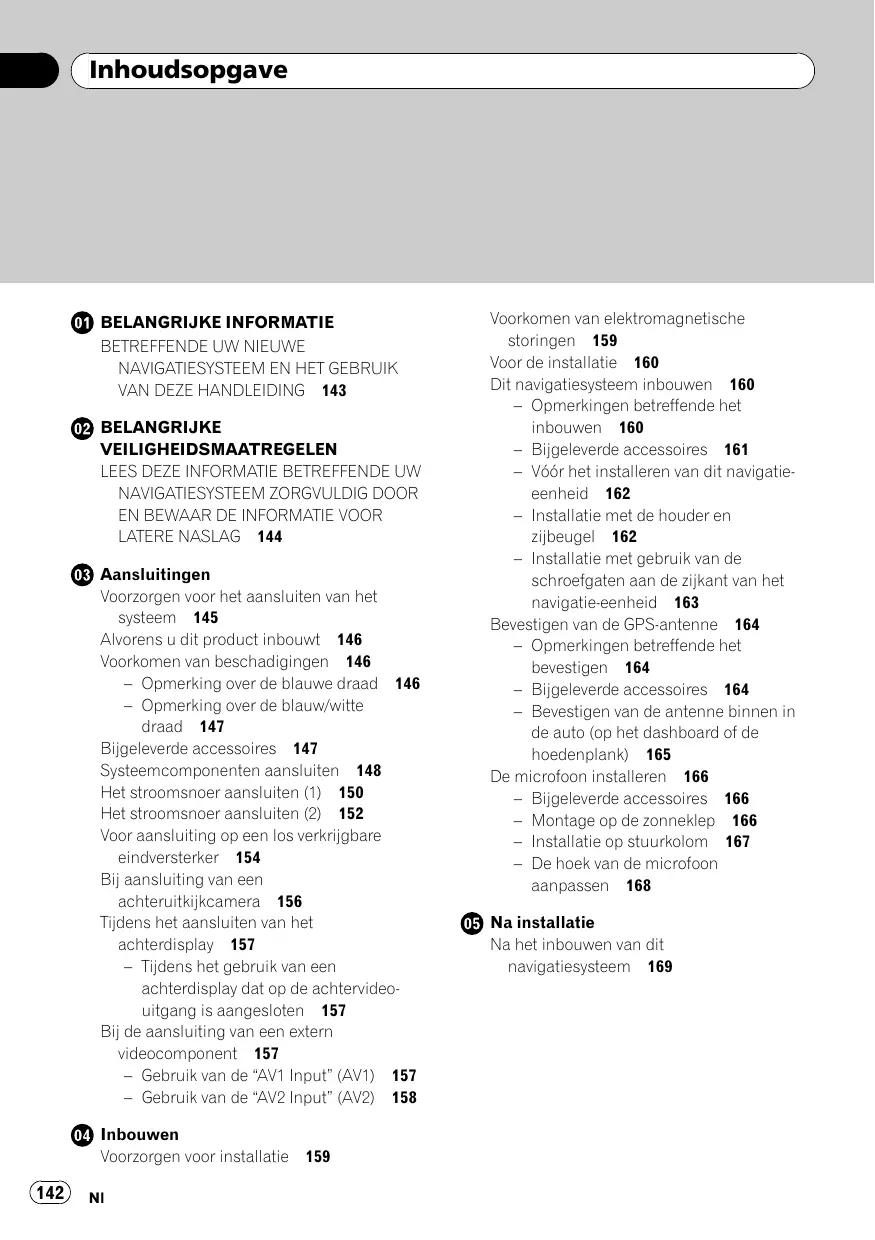 LATERE NASLAG 144 @® Aansluitingen Voorzorgen voor het aansluiten van het system 145 Alvorens u dit product inbouwt 146 Voorkomen van beschadigingen 146 — Opmerking over de blauwe draad 146 — Opmerking over de blauw/witte draad 147 Bijgeleverde accessoires 147 Systeemcomponenten aansluiten 148 Het stroomsnoer aansluiten (1) 150 Het stroomsnoer aansluiten (2) 152 Voor aansluiting op een los verkrijgbare eindversterker 154 Bij aansluiting van een achteruitkijkcamera 156 Tijdens het aansluiten van het achterdisplay 157 — Tijdens het gebruik van een achterdisplay dat op de achtervideo- uitgang is aangesloten 157 Bij de aansluiting van een extern videocomponent 157 — Gebruik van de AVI Input” (AVI) 157 — Gebruik van de ‘AV2 Input” (AV2) 158 @ inbouwen Voorzorgen voor installatie 159 Voorkomen van elektromagnetische storingen 159 Voor de installatie 160 Dit navigatiesysteem inbouwen 160 — Opmerkingen betreffende het inbouwen 160 — Bijgeleverde accessoires 161 — Véôr het installeren van dit navigatie eenheid_ 162 — Installatie met de houder en zijbeugel 162 Installatie met gebruik van de schroefgaten aan de zijkant van het navigatie-eenheid 163 Bevestigen van de GPS-antenne 164 — Opmerkingen betreffende het bevestigen 164 — Bijgeleverde accessoires 164 — Bevestigen van de antenne binnen in de auto (op het dashboard of de hoedenplank) 165 De microfoon installeren 166 — Bijgeleverde accessoires 166 — Montage op de zonneklep 166 — Installatie op stuurkolom 167 — De hoëk van de microfoon aanpassen 168 @® Na installatie Na het inbouwen van dit navigatiesysteem 169