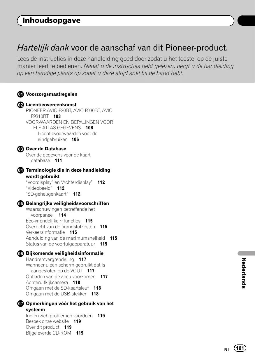 Licentieovereenkomst PIONEER AVIC-F30BT, AVIC-F930BT, AVIC- F9310BT 103 VOORWAARDEN EN BEPALINGEN VOOR TELE ATLAS GEGEVENS 106 — Licentievoorwaarden voor de eindgebruiker 106