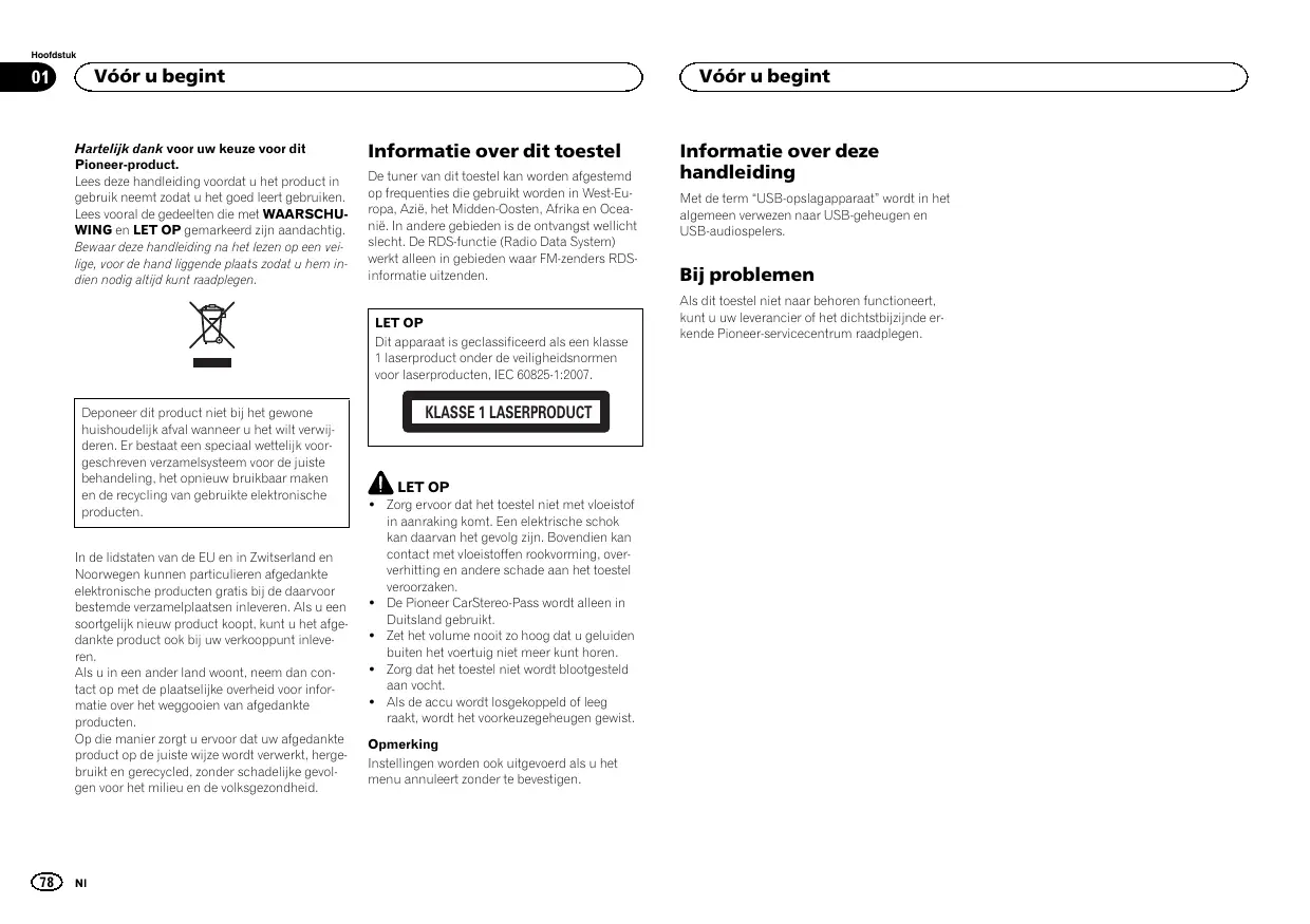KLASSE 1 LASERPRODUCT LET OP ! Zorg ervoor dat het toestel niet met vloeistof in aanraking komt. Een elektrische schok kan daarvan het gevolg zijn. Bovendien kan contact met vloeistoffen rookvorming, oververhitting en andere schade aan het toestel veroorzaken. ! De Pioneer CarStereo-Pass wordt alleen in Duitsland gebruikt. ! Zet het volume nooit zo hoog dat u geluiden buiten het voertuig niet meer kunt horen. ! Zorg dat het toestel niet wordt blootgesteld aan vocht. ! Als de accu wordt losgekoppeld of leeg raakt, wordt het voorkeuzegeheugen gewist. Opmerking Instellingen worden ook uitgevoerd als u het menu annuleert zonder te bevestigen.