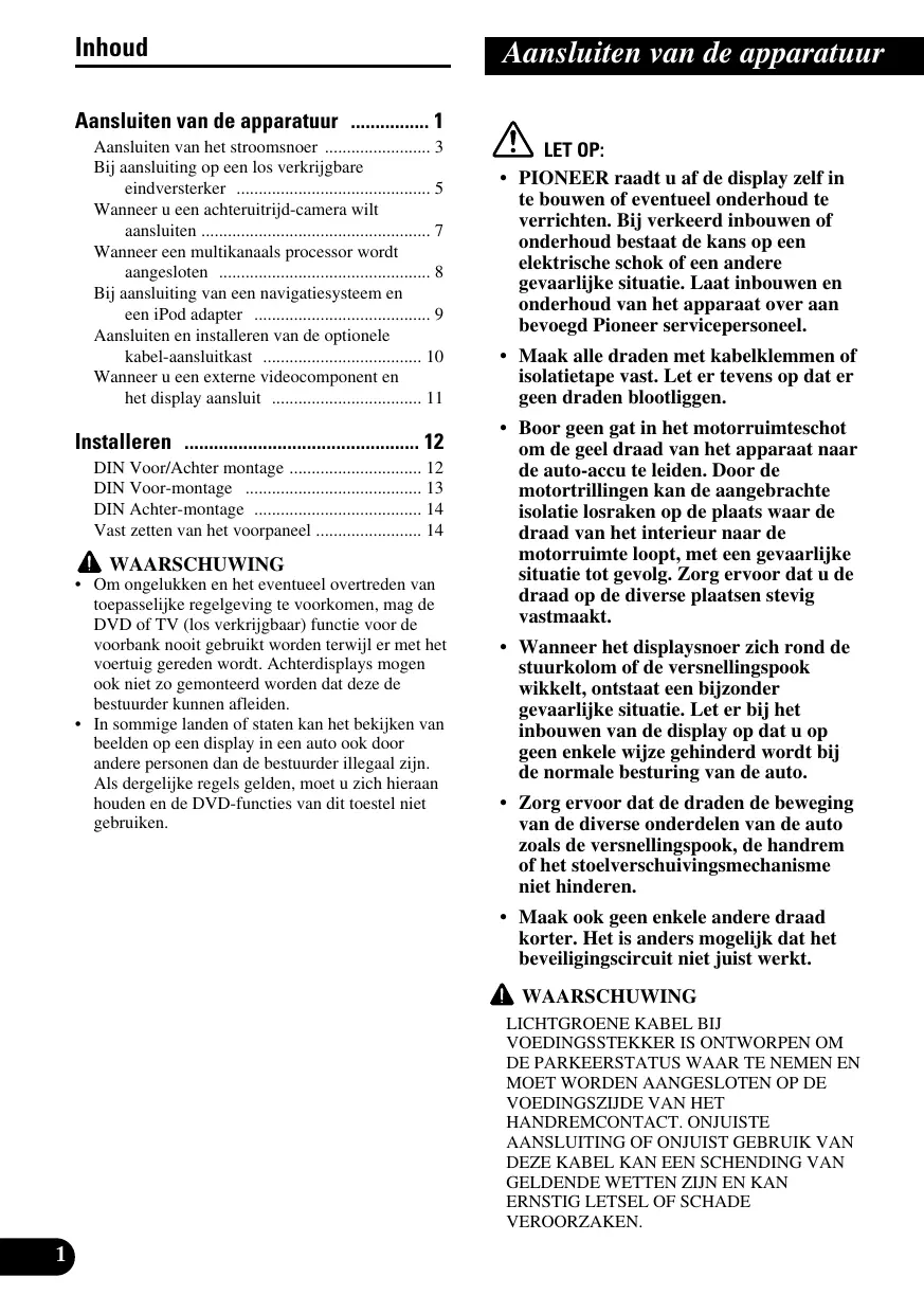 Inhoud Aansluiten van de apparatuur . Aansluiten van het stroomsnoer Bij aansluiting op een los verkrijgbare eindversterker 5 Wanneer u een achteruitrijd aansluiten 7 Wanneer een multikanaals processor wordt aangesloten . 8 Bij aansluiting van een navigatiesysteem en een iPod adapter Aansluiten en installeren van de optionele Kabel-aansluitkast Wanneer u een externe videocomponent en het display aansluit … Installeren DIN Voor/Achter montage . DIN Voor-montage DIN Achter-montage Vast zetten van het voorpaneel . À WAARSCHUWING + Om ongelukken en het eventueel overtreden van tocpasselijke regelgeving te voorkomen, mag de DVD of TV (los verkrijgbaar) functie voor de voorbank nooit gebruikt worden terwijl er met het voertuig gereden wordt. Achterdisplays mogen ook niet zo gemonteerd worden dat deze de bestuurder kunnen afleiden. In sommige landen of staten kan het bekijken van beelden op een display in een auto ook door andere personen dan de bestuurder illegaal zijn. Als dergelijke regels gelden, moet u zich hieraan houden en de DVD-funct van dit toestel niet gebruiken. ansluiten van de apparatuur VAN LET OP: + PIONEER raadt u af de display zelf in te bouwen of eventucel onderhoud te verrichten. Bij verkeerd inbouwen of onderhoud bestaat de kans op een elektrische schok of een andere gevaarlijke situatie. Laat inbouwen en onderhoud van het apparaat over aan bevoegd Pioneer servicepersoneel. Maak alle draden met kabelklemmen of isolatietape vast. Let er tevens op dat er geen draden blootliggen. Boor geen gat in het motorruimteschot om de geel draad van het apparaat naar de auto-aceu te leiden. Door de motortrillingen kan de aangebrachte isolatie losraken op de plaats waar de draad van het interieur naar de motorruimte loopt, met een gevaarlijke situatie tot gevolg. Zorg ervoor dat u de draad op de diverse plaatsen stevig vastmaakt. Wanneer het displaysnoer zich rond de stuurkolom of de versnellingspook wikkelt, ontstaat een bijzonder gevaarlijke situatie. Let er bij het inbouwen van de display op dat u op geen enkele wijze gehinderd wordt bij de normale besturing van de auto. + Zorg ervoor dat de draden de beweging van de diverse onderdelen van de auto zoals de versnellingspook, de handrem of het stoelverschuivingsmechanisme niet hinderen. Maak ook geen enkele andere draad korter. Het is anders mogelijk dat het beveiligingscircuit niet juist werkt. À WAARSCHUWING
