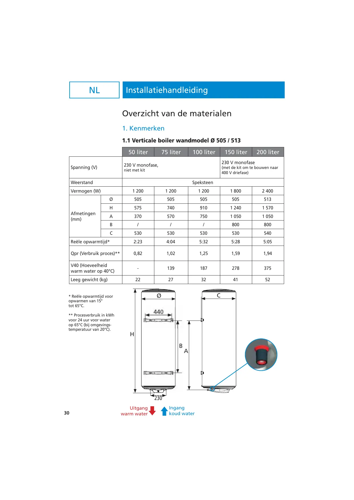100 liter Spanning (V) 150 liter 230 V monofase (met de kit om te bouwen naar 400 V driefase) Weerstand Speksteen Vermogen (W) Afmetingen (mm) 200 liter