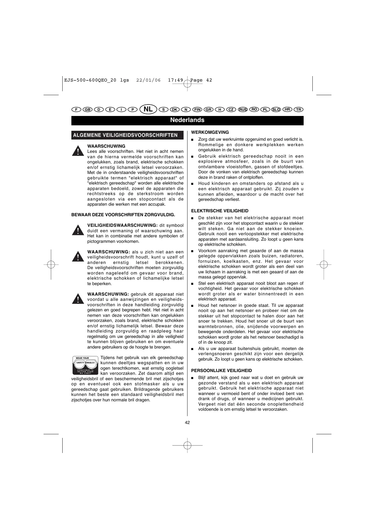 Blijf attent, kijk goed naar wat u doet en gebruik uw gezonde verstand als u een elektrisch apparaat gebruikt. Gebruik het elektrische apparaat niet wanneer u vermoeid bent of onder invloed bent van drank of drugs, of wanneer u medicijnen gebruikt. Vergeet niet dat één seconde onoplettendheid voldoende is om ernstig letsel te veroorzaken. 22/01/06 EJS-500-600QEO_20 lgs