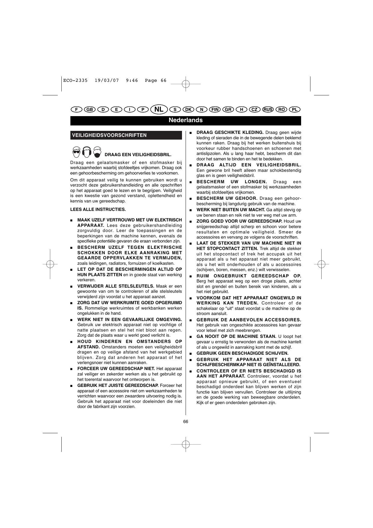 VEILIGHEIDSVOORSCHRIFTEN DRAAG EEN VEILIGHEIDSBRIL. Draag een gelaatsmasker of een stofmasker bij werkzaamheden waarbij stofdeeltjes vrijkomen. Draag ook een gehoorbescherming om gehoorverlies te voorkomen.