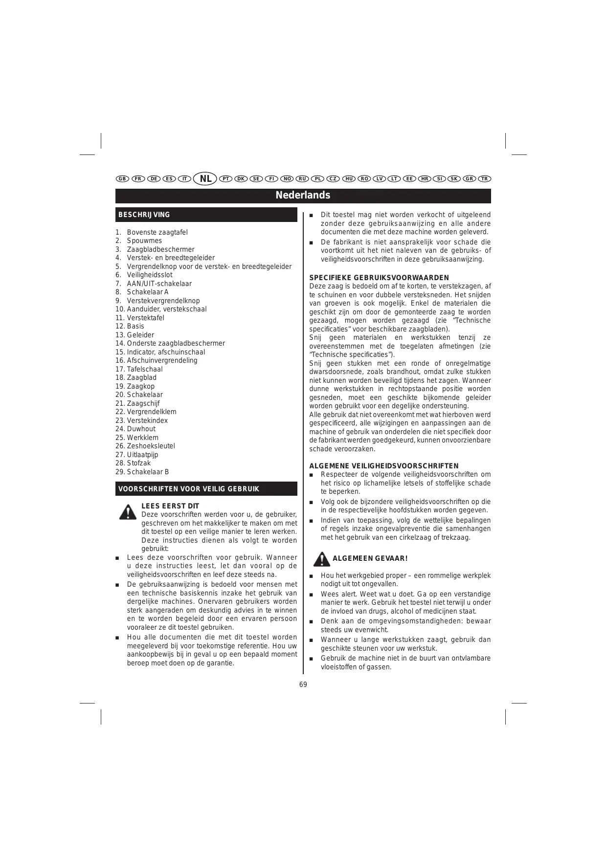 - Het zaagblad - De buitenste zaagflens - De asmoer - De zaagbladbeschermer GEVAAR! Gebruik geen schoonmaakproducten (vb. om harsresidu te verwijderen) dat de neiging heeft te corroderen met de lichte metalen onderdelen van de machine; de stabiliteit van de zaag zou in gevaar kunnen komen.