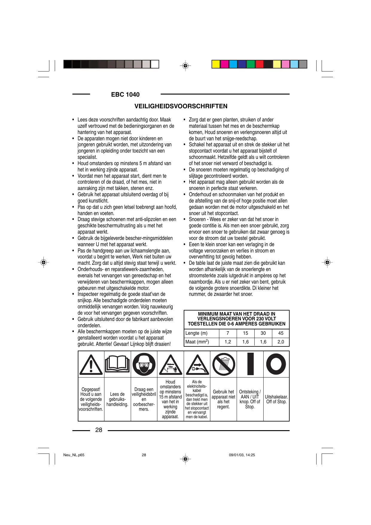 • Attention! Danger! La tête de coupe continue à tourner! • Veillez à ce que l’appareil ne soit pas enco mbré de végétation ou autres matériaux. • Gardez toujours le cordon d’alimentation et les rallonges à distance des outils de coupe. • Éteignez l’appareil et débranchez la prise principal0 avant tout ajustage ou nettoyage. • Procédez de même pour tester les cordons enchevêtrés ou abîmés. • Les cordons doivent être vérifiés régulièrement afin de détecter tout dommage ou usure. • L’appareil ne doit être utilisé que si les cordons sont en parfaite condition. • Ne procéder à l’entretien et au nettoyage de l’appareil ou au réglage de la position de coupe que lorsque le moteur est arrêté et que le cordon d’alimentation est débranché. • Prolongateurs: Assurez-vous qu’ils sont en bon état et d’un calibre suffisant pour transporter le courant nécessaire à l’appareil. Un cordon de taille insuffisante provoquerait une baisse de tension et une surchauffe. Le tableau ci-dessous indique la dimension correcte à utiliser en fonction de la longueur du cordon et du nombre d’ampères. En cas de doute, utilisez un cordon d’un calibre supérieur. Plus le chiffre correspondant au calibrage est petit, plus le cordon est résistant. SECTION MINIMUM DES PROLONGATEURS POUR DES APPAREILS DE 230 VOLTS UTILISANT DE 0 A 6 AMPERES Longueur (m)