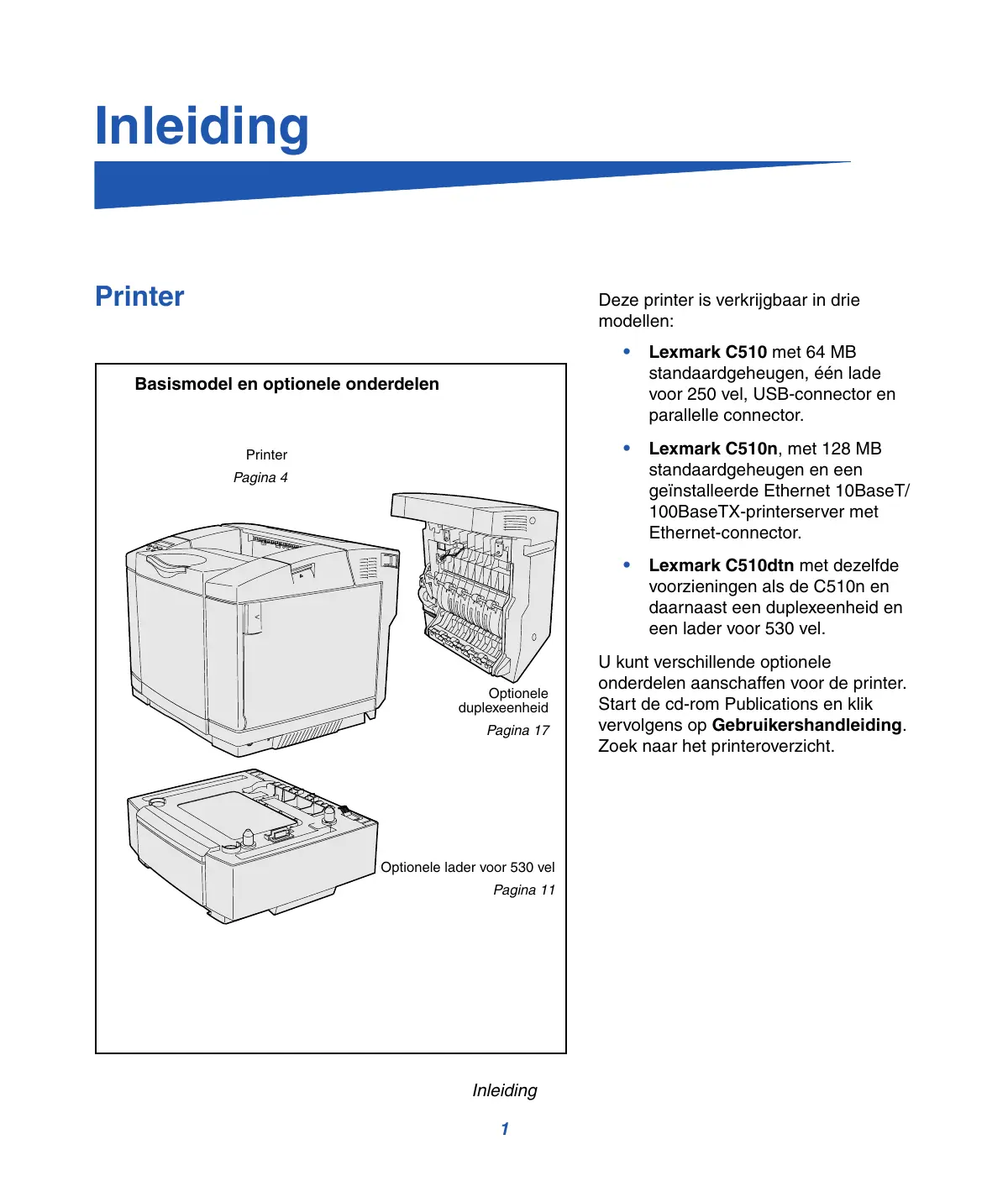 Lexmark C510dtn met dezelfde voorzieningen als de C510n en daarnaast een duplexeenheid en een lader voor 530 vel. Basismodel en optionele onderdelen Printer Pagina 4 Optionele duplexeenheid Pagina 17 Optionele lader voor 530 vel Pagina 11 Inleiding
