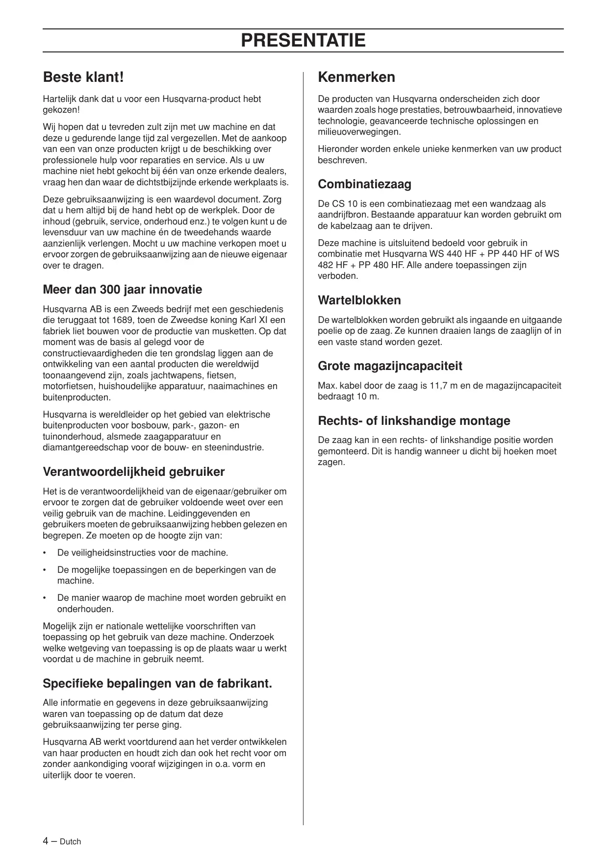 De manier waarop de machine moet worden gebruikt en onderhouden. Mogelijk zijn er nationale wettelijke voorschriften van toepassing op het gebruik van deze machine. Onderzoek welke wetgeving van toepassing is op de plaats waar u werkt voordat u de machine in gebruik neemt. Specifieke bepalingen van de fabrikant. Alle informatie en gegevens in deze gebruiksaanwijzing waren van toepassing op de datum dat deze gebruiksaanwijzing ter perse ging. Husqvarna AB werkt voortdurend aan het verder ontwikkelen van haar producten en houdt zich dan ook het recht voor om zonder aankondiging vooraf wijzigingen in o.a. vorm en uiterlijk door te voeren. 4 – Dutch Hieronder worden enkele unieke kenmerken van uw product beschreven. Combinatiezaag De CS 10 is een combinatiezaag met een wandzaag als aandrijfbron. Bestaande apparatuur kan worden gebruikt om de kabelzaag aan te drijven. Deze machine is uitsluitend bedoeld voor gebruik in combinatie met Husqvarna WS 440 HF + PP 440 HF of WS 482 HF + PP 480 HF. Alle andere toepassingen zijn verboden. Wartelblokken De wartelblokken worden gebruikt als ingaande en uitgaande poelie op de zaag. Ze kunnen draaien langs de zaaglijn of in een vaste stand worden gezet. Grote magazijncapaciteit Max. kabel door de zaag is 11,7 m en de magazijncapaciteit bedraagt 10 m. Rechts- of linkshandige montage De zaag kan in een rechts- of linkshandige positie worden gemonteerd. Dit is handig wanneer u dicht bij hoeken moet zagen. PRESENTATIE