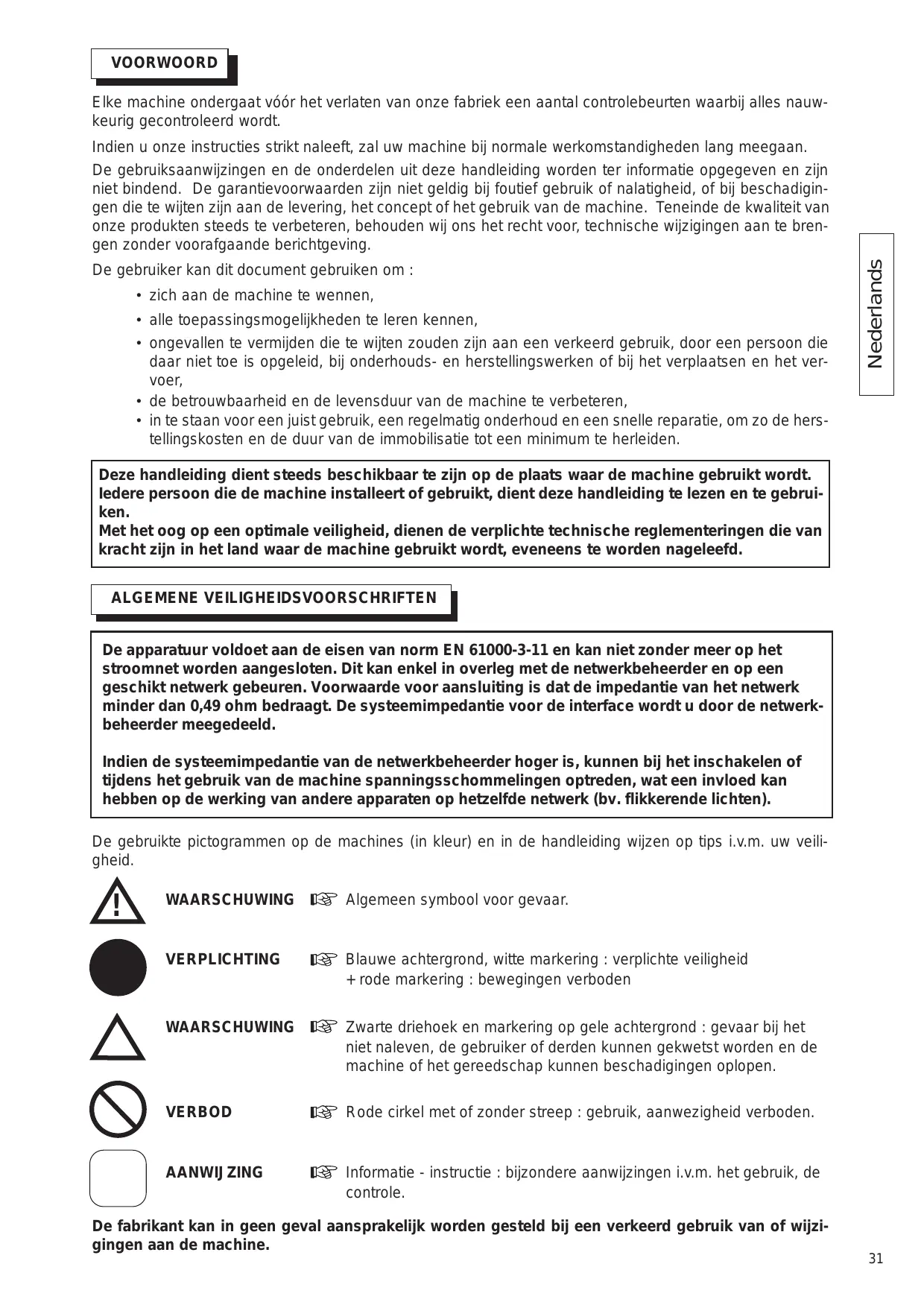 (por ejemplo, luces parpadeantes). Los pictogramas que figuran en las máquinas (en color) y en el manual indicarán algunos consejos referentes a su seguridad. Comprobar periódicamente el cable de alimentación. Permanecer siempre muy atento durante el trabajo . Comprobar si la fijación de las piezas (vibración anormal) y el montaje de los platos son correctos.