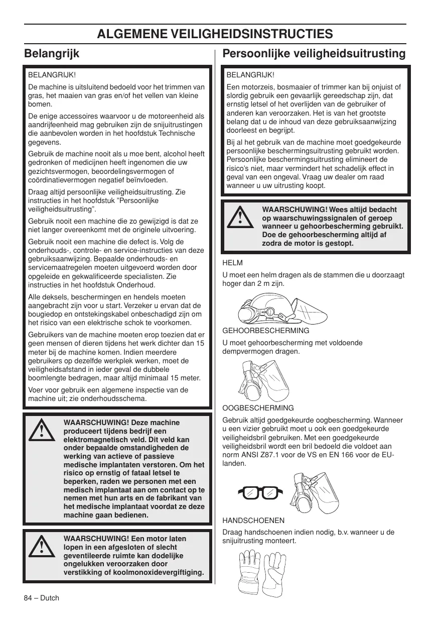 84 – Dutch WAARSCHUWING! Deze machine produceert tijdens bedrijf een elektromagnetisch veld. Dit veld kan onder bepaalde omstandigheden de werking van actieve of passieve medische implantaten verstoren. Om het risico op ernstig of fataal letsel te beperken, raden we personen met een medisch implantaat aan om contact op te nemen met hun arts en de fabrikant van het medische implantaat voordat ze deze machine gaan bedienen. WAARSCHUWING! Een motor laten lopen in een afgesloten of slecht geventileerde ruimte kan dodelijke ongelukken veroorzaken door verstikking of koolmonoxidevergiftiging. Gebruik altijd goedgekeurde oogbescherming. Wanneer u een vizier gebruikt moet u ook een goedgekeurde veiligheidsbril gebruiken. Met een goedgekeurde veiligheidsbril wordt een bril bedoeld die voldoet aan norm ANSI Z87.1 voor de VS en EN 166 voor de EUlanden. HANDSCHOENEN Draag handschoenen indien nodig, b.v. wanneer u de snijuitrusting monteert. ALGEMENE VEILIGHEIDSINSTRUCTIES LAARZEN Gebruik laarzen met stalen neus en anti-slip zool. KLEDING Draag kleding van stevige stof en draag geen loszittende kleding die gemakkelijk vast kan haken in takken en struikgewas. Draag altijd een stevige lange broek. Draag geen sieraden, korte broek of sandalen en loop niet op blote voeten. Zorg ervoor dat uw haar niet lager dan uw schouders hangt. EHBO-KIT U moet altijd een EHBO-kit bij de hand hebben.