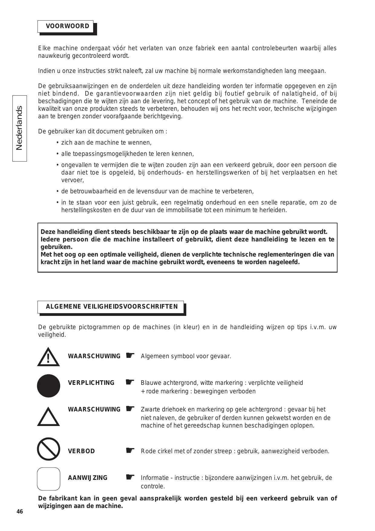 VOORWOORD Elke machine ondergaat vôér het verlaten van onze fabriek een aantal controlebeurten waarbij alles nauwkeurig gecontroleerd wordt. Indien u onze instructies strikt naleeft, zal uw machine bij normale werkomstandigheden lang meegaan. De gebruiksaanwijzingen en de onderdelen uit deze handleiding worden ter informatie opgegeven en zijn niet bindend. De garantievoorwaarden zijn niet geldig bij foutief gebruik of nalatigheid, of bij beschadigingen die te wijten zijn aan de levering, het concept of het gebruik van de machine. Teneinde de kwaliteit van onze produkten steeds te verbeteren, behouden wij ons het recht voor, technische wijzigingen aan te brengen zonder voorafgaande berichtgeving. De gebruiker kan dit document gebruiken om : + zich aan de machine te wennen,